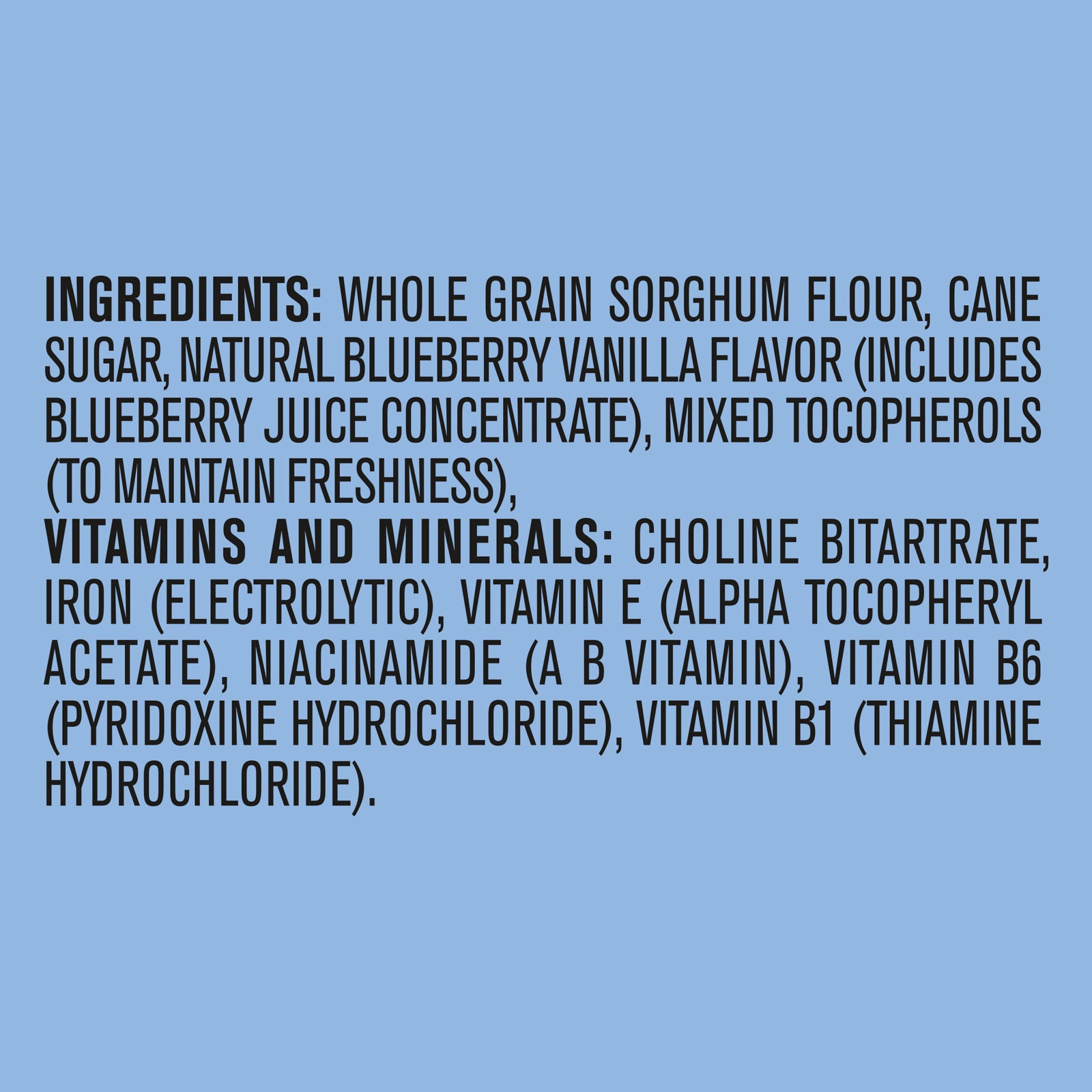 Whole grain sorghum flour, cane sugar, natural blueberry vanilla flavor (includes blueberry juice concentrate), mixed tocopherols (to maintain freshness) vitamins and minerals: choline bitartrate iron (electrolytic), vitamin e (alpha tocopheryl acetate), niacinamide (a b vitamin), vitamin b6 'pyridoxine hydrochloride), vitamin b1 (thiamine hydrochloride).