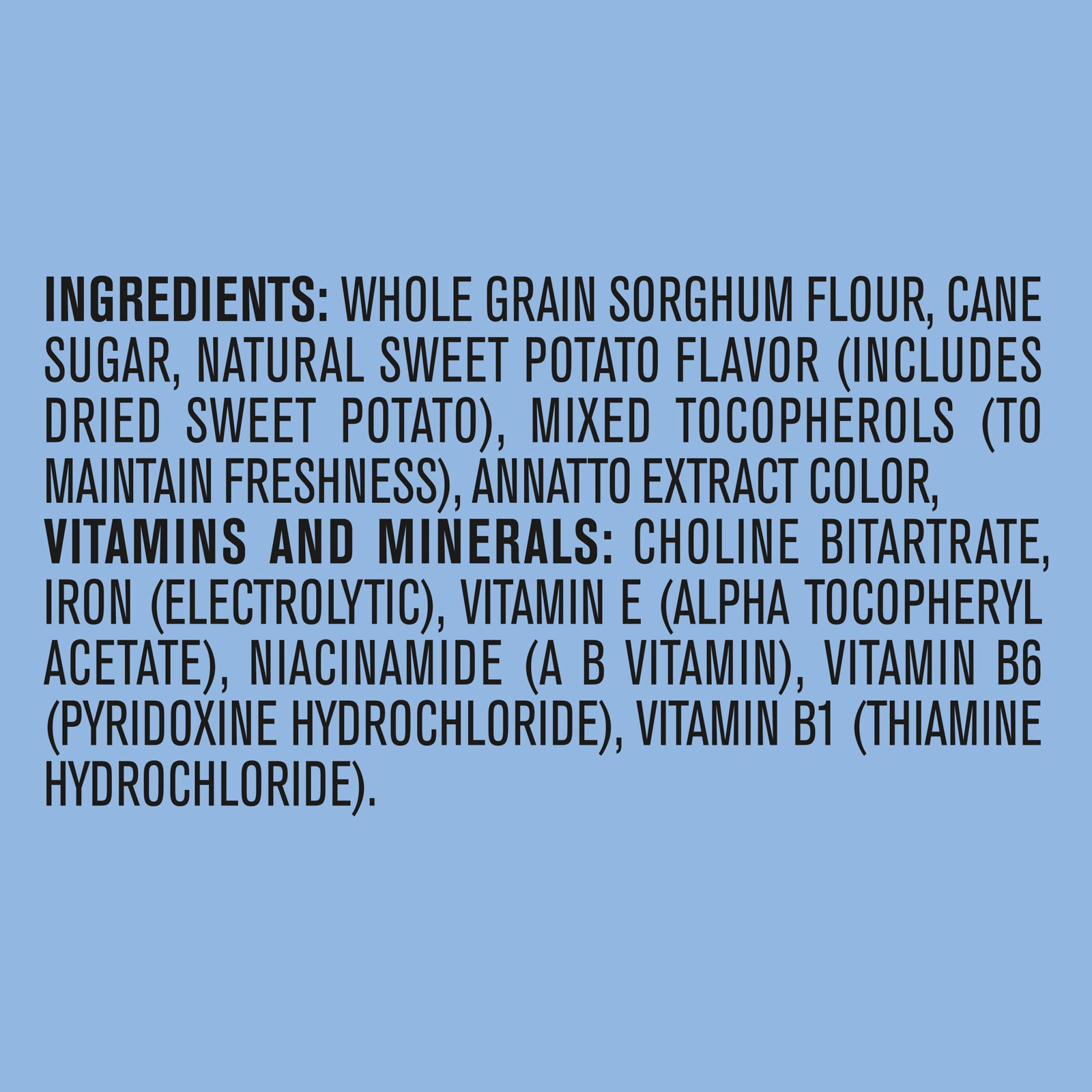 Whole grain sorghum flour, cane sugar, natural sweet potato flavor (includes dried sweet potato), mixed tocopherols (to maintain freshness), annatto extract color, vitamins and minerals: choline bitartrate, iron (electrolytic), vitamin e (alpha tocopheryl acetate), niacinamide (a b vitamin), vitamin b6 (pyridoxine hydrochloride), vitamin b1 (thiamine hydrochloride).