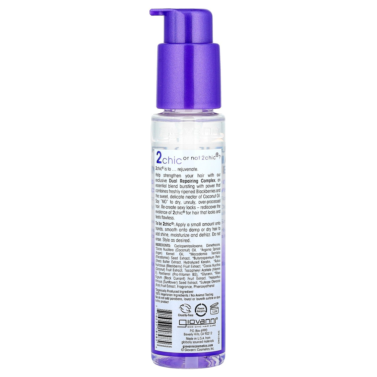 To be 2chic®: Apply a small amount onto hands, smooth onto damp or dry hair to add shine, moisturize and defrizz. Do not rinse. Style as desired.