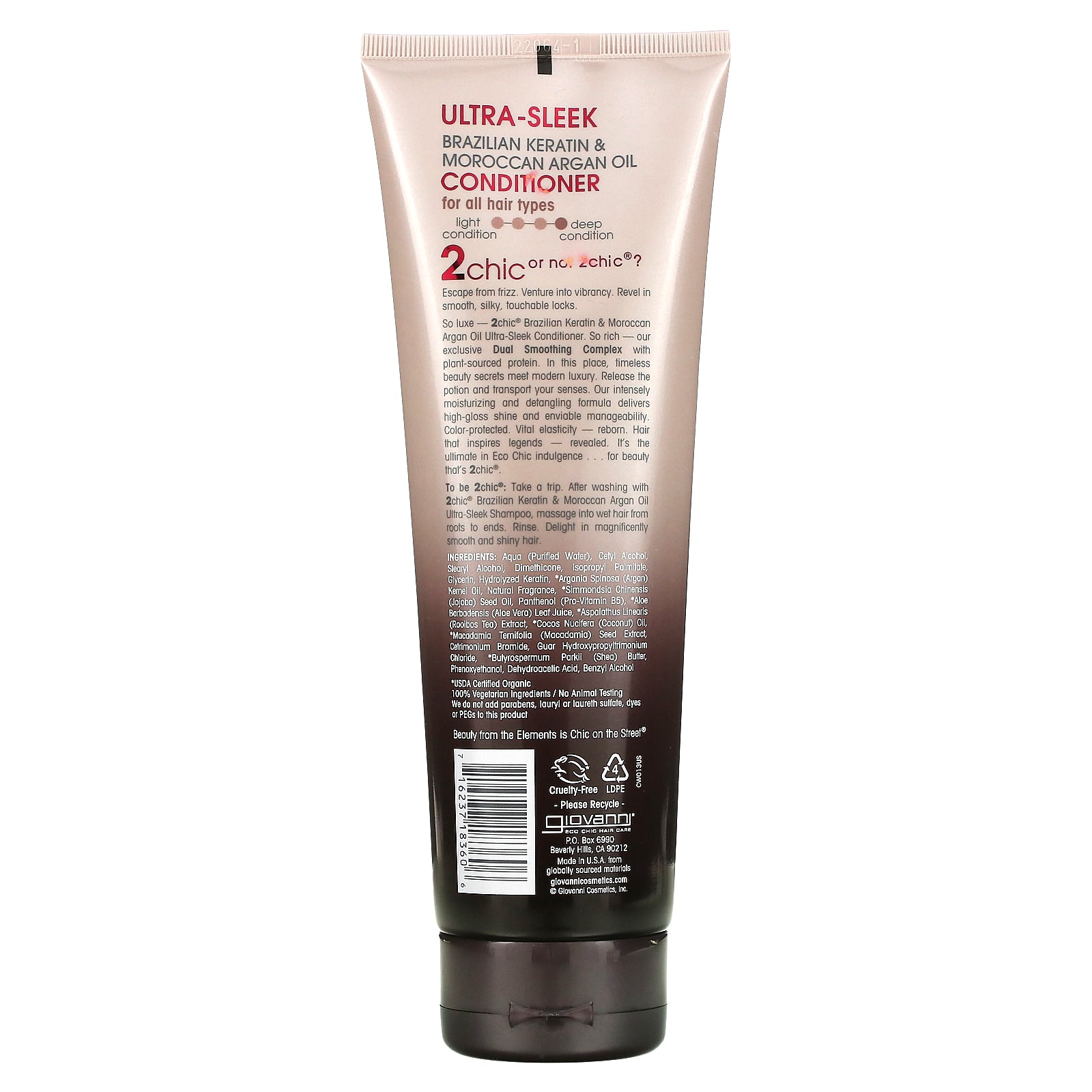 So luxe - 2chic® Brazilian Keratin & Moroccan Argan Oil Ultra-Sleek Conditioner. So rich - our exclusive Dual Smoothing Complex with plant-sourced protein. In this place, timeless beauty secrets meet modern luxury. Release the potion and transport your senses. Our intensely moisturizing, detangling formula delivers high-gloss shine and enviable manageability. Color-protected. Vital elasticity -reborn. Hair that inspires legends -revealed. It's the ultimate in Eco Chic indulgence... for beauty that's 2chic®.