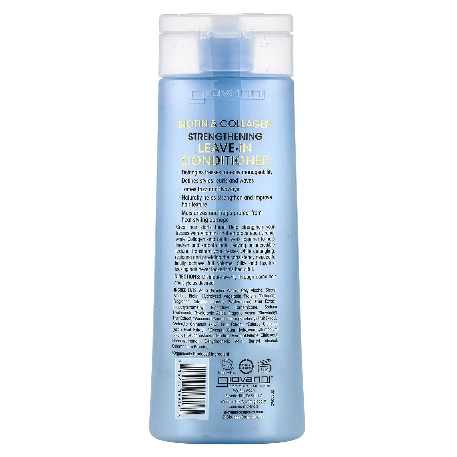 Aqua (purified water), cetyl alcohol, stearyl alcohol, biotin, hydrolyzed vegetable protein (collagen), fragrance, citrullus lanatus (watermelon) fruit extract, propoxy tetramethyl piperidinyl dimethicone, sodium hyaluronate (hyaluronic acid), fragaria vesca (strawberry) fruit extract, *vaccinium angustifolium (blueberry) fruit extract, *actinidia chinensis (kiwi) fruit extract, *euterpe oleracea (acai) fruit extract, *glycerin, guar hydroxypropyltrimonium chloride, leuconostoc/radish root ferment filtrate, citric acid, phenoxyethanol, dehydroacetic acid, benzyl alcohol, cetrimonium bromide.