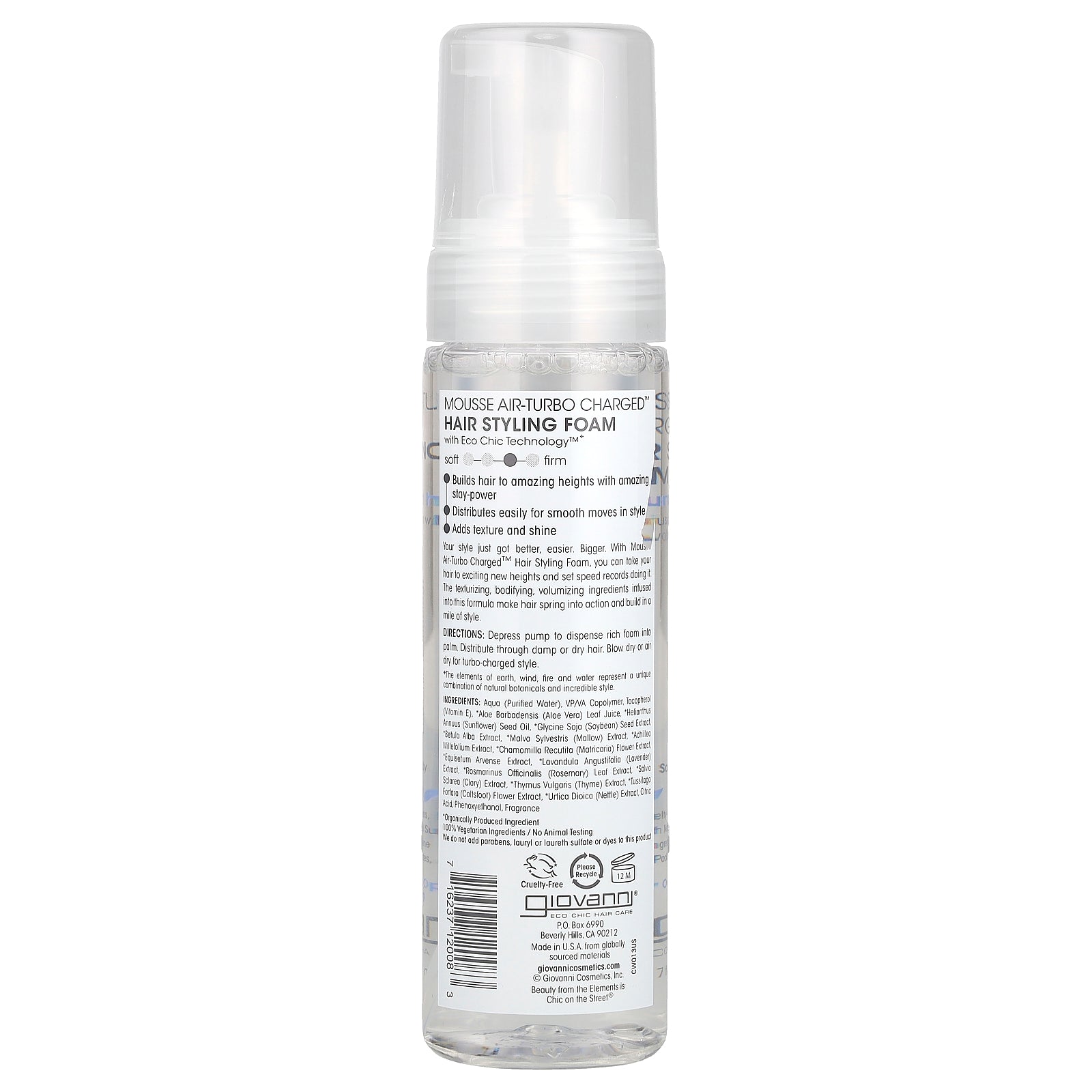 Depress pump to dispense rich foam into palm. Distribute through damp or dry hair. Blow dry or air dry for turbo-charged style.