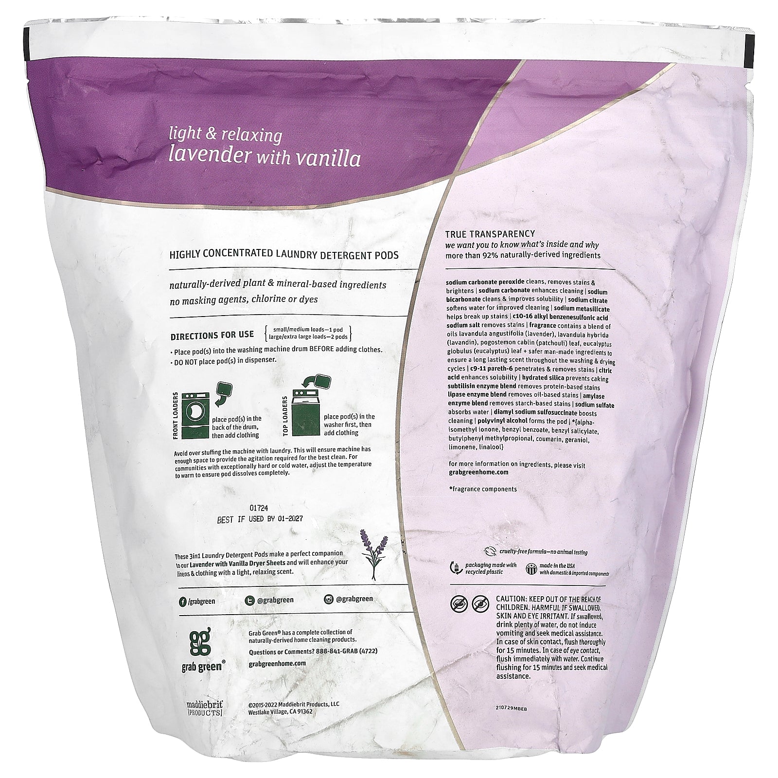 | fragrance | contains a blend of oils lavandula angustifolia (lavender), lavandula hybrida (lavandin), pogostemon cablin (patchouli) leaf, eucalyptus globulus (eucalyptus) leaf + safer man-made ingredients to ensure a long lasting scent throughout the washing and drying cycles |