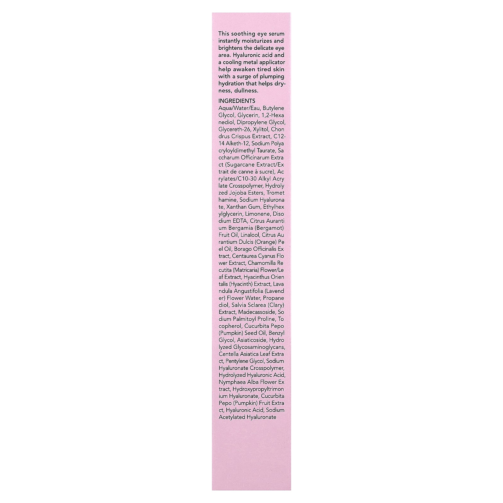 This soothing eye serum instantly moisturizes and brightens the delicate eye area. Hyaluronic acid and a cooling metal applicator help awaken tired skin with a surge of plumping hydration that helps dryness, dullness.