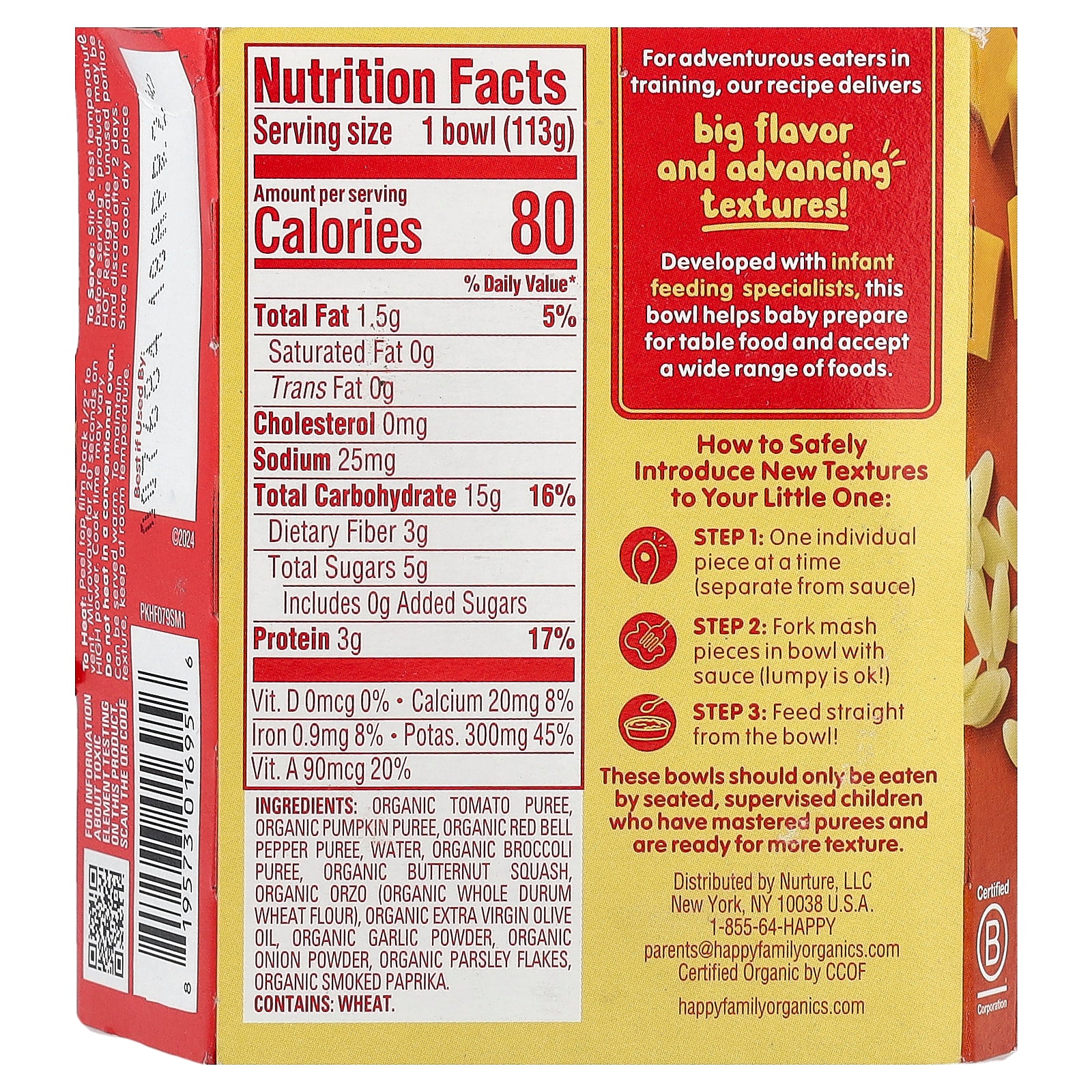 Organic tomato puree, organic pumpkin puree, organic red bell pepper puree, water, organic broccoli puree, organic butternut squash, organic orzo (organic whole durum wheat flour), organic extra virgin olive oil, organic garlic powder, organic onion powder, organic parsley flakes, organic smoked paprika.