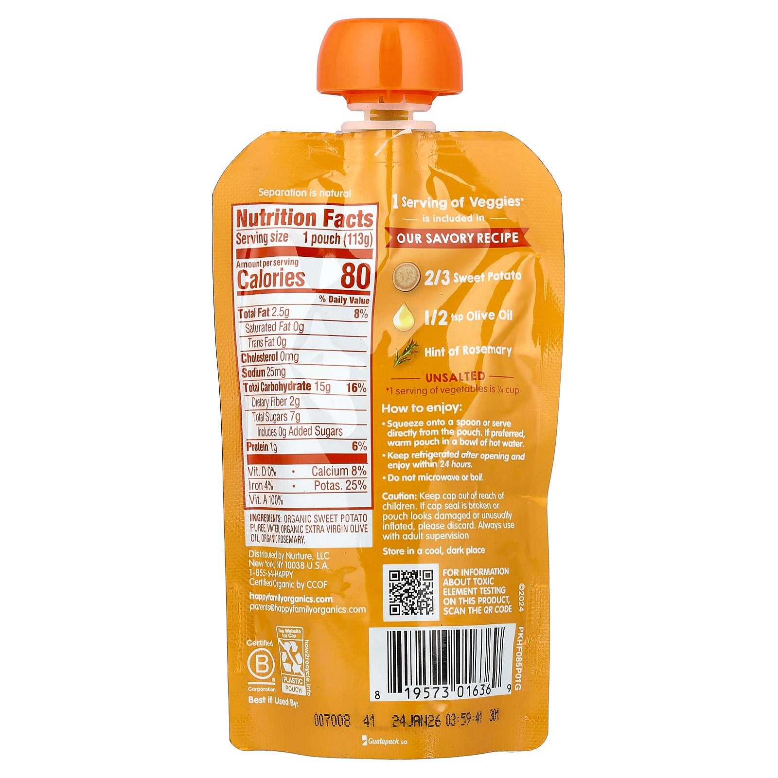 Organic sweet potato puree, water, organic extra virgin olive oil, organic rosemary.
