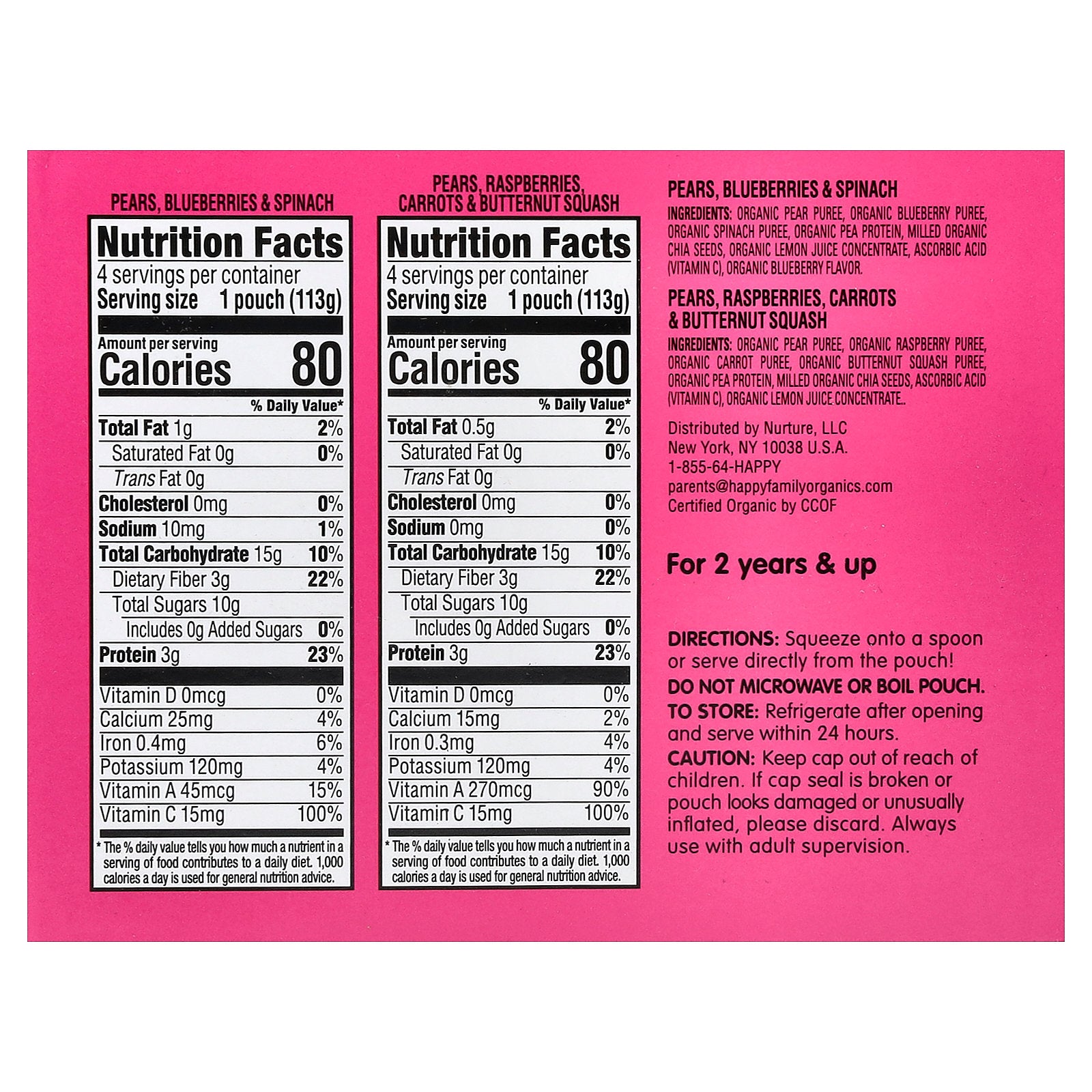 Pears, Raspberries, Carrots & Butternut Squash Ingredients: Organic pear puree, organic raspberry puree, organic carrot puree, organic butternut squash puree, organic pea protein, milled organic chia seeds, ascorbic acid (vitamin c), organic lemon juice concentrate.
