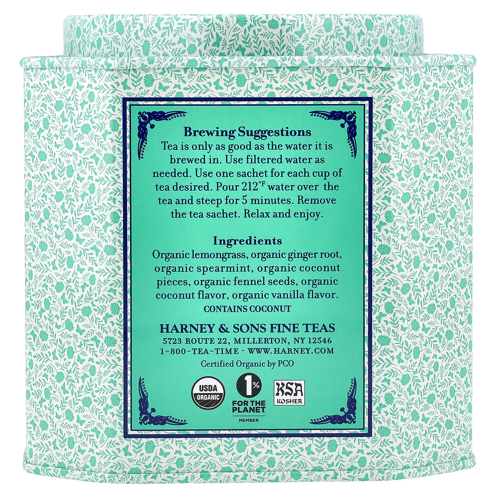 Organic lemongrass, organic ginger root, organic spearmint, organic coconut pieces, organic fennel seeds, organic coconut flavor, organic vanilla flavor.
