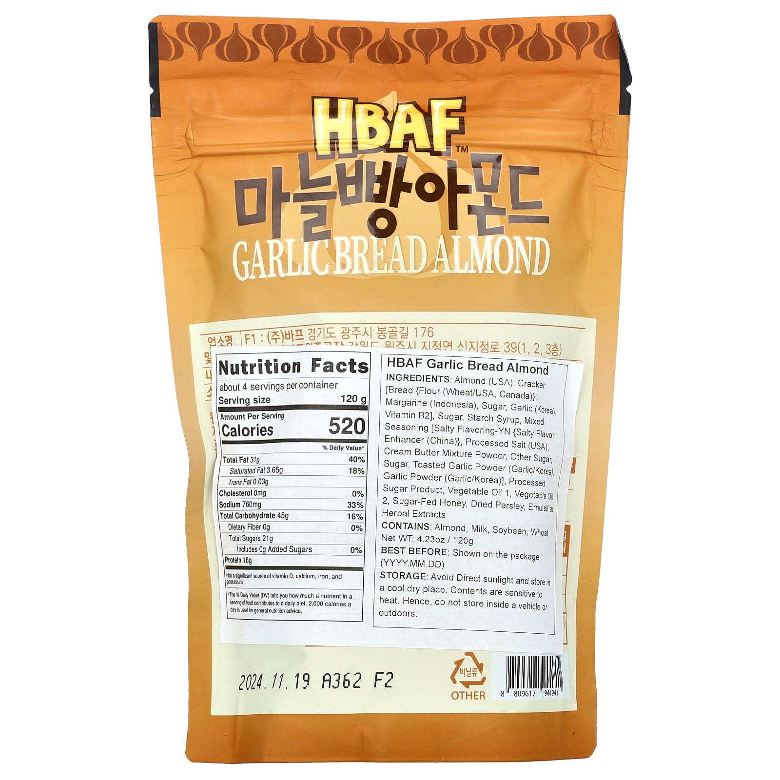 Almond (usa), cracker [bread {flour (wheat/usa, canada)}, margarine (indonesia), sugar, garlic (korea), vitamin b2], sugar, starch syrup, mixed seasoning [salty flavoring-yn {salty flavor enhancer (china)}, processed salt (usa), cream butter mixture powder, other sugar, sugar, toasted garlic powder (garlic/korea), garlic powder (garlic/korea)], processed sugar product, vegetable oil 1, vegetable oil 2, sugar-fed honey, dried parsley, emulsifier, herbal extracts.
