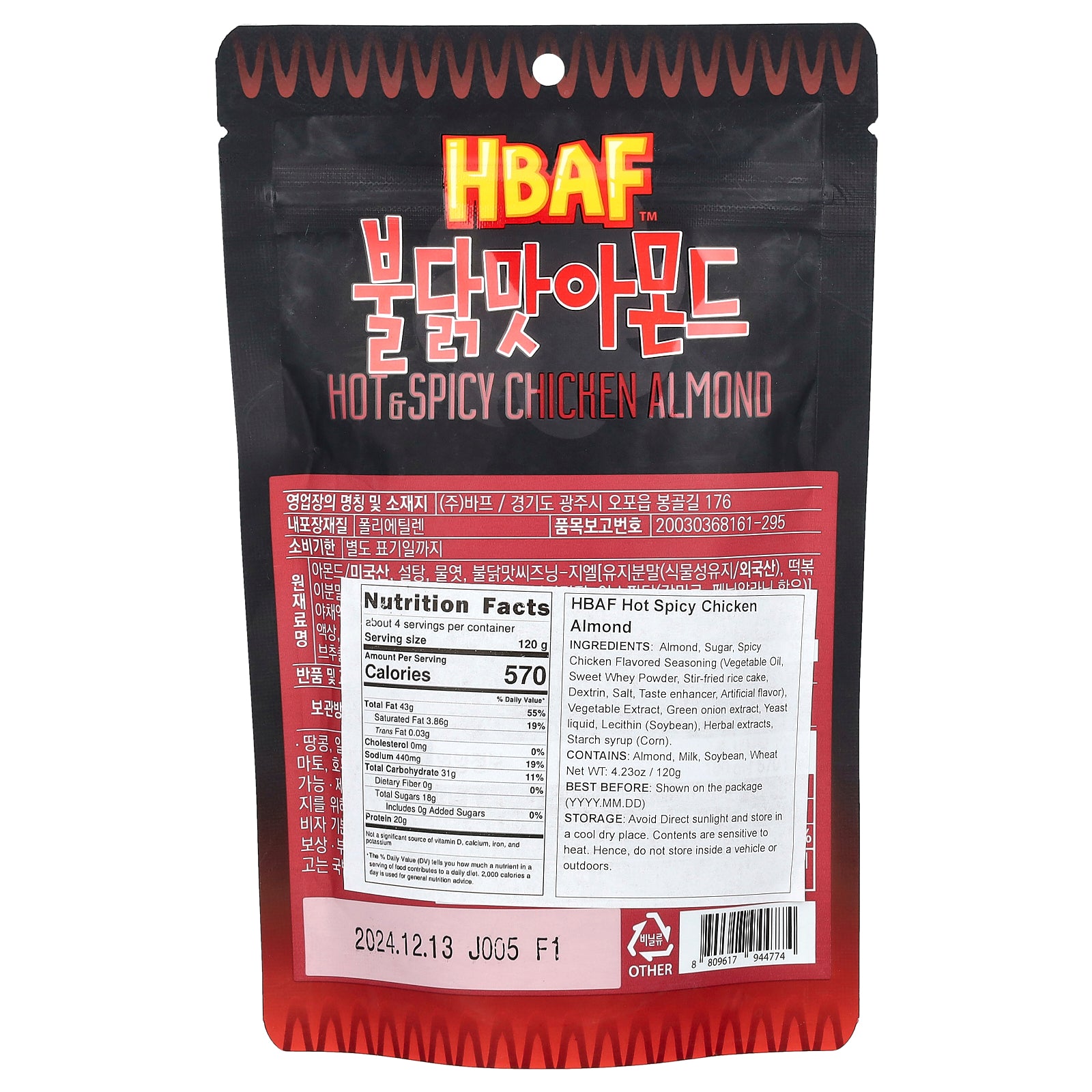 Almond, sugar, spicy chicken flavored seasoning (vegetable oil, sweet whey powder, stir-fried rice cake, dextrin, salt, taste enhancer, artificial flavor), vegetable extract, green onion extract, yeast liquid, lecithin (soybean), herbal extracts, starch syrup (corn).