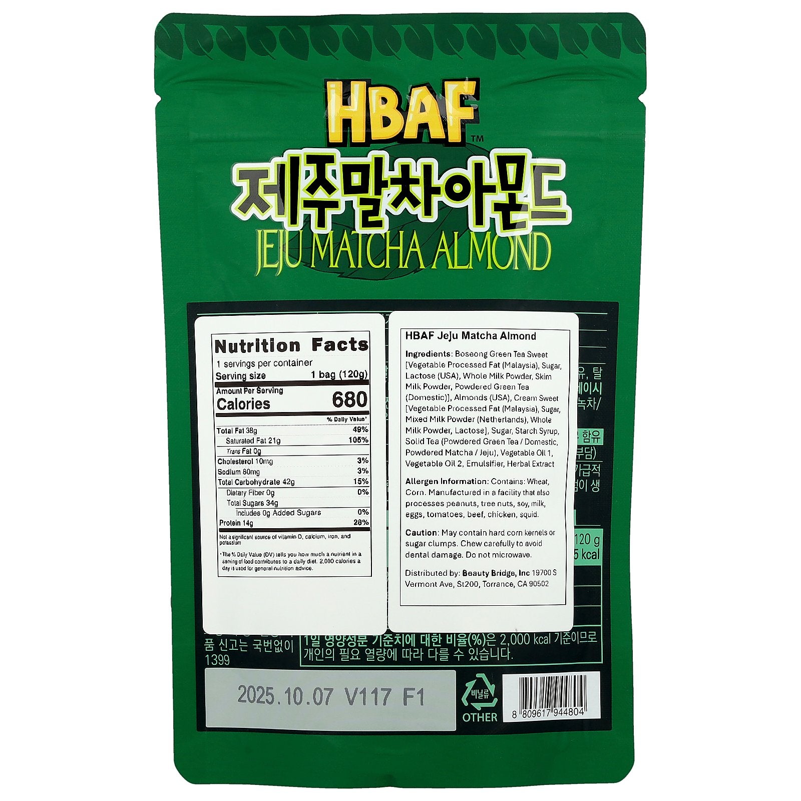 Boseong green tea sweet [vegetable processed fat (malaysia), sugar, lactose (usa), whole milk powder, skim milk powder, powdered green tea (domestic)], almonds (usa), cream sweet [vegetable processed fat (malaysia), sugar, mixed milk powder (netherlands), whole milk powder, lactose], sugar, starch syrup, solid tea (powdered green tea / domestic, powdered matcha / jeju), vegetable oil 1, vegetable oil 2, emulsifier, herbal extract.