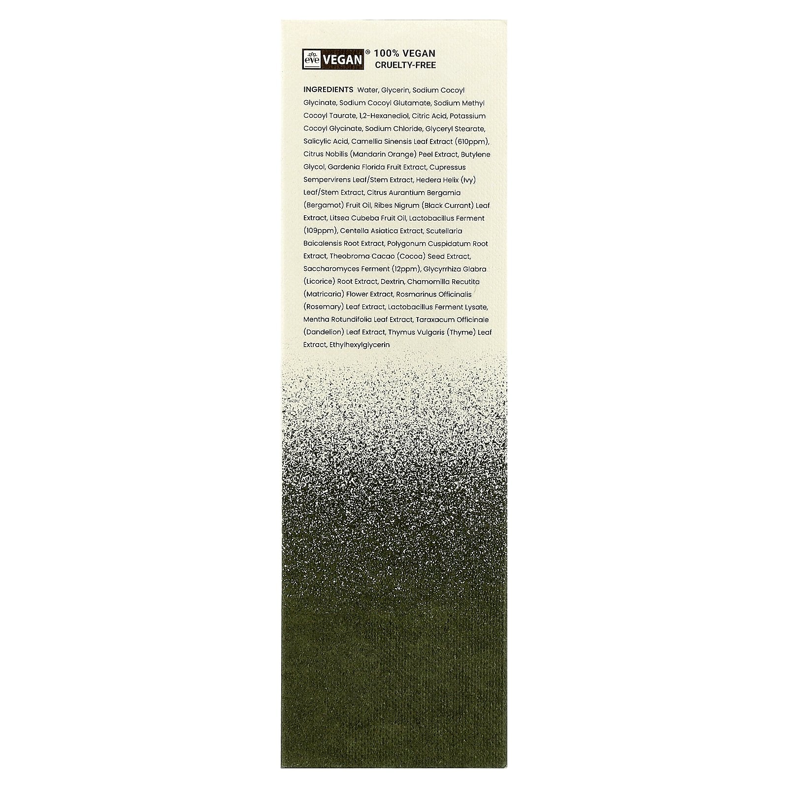 Water, glycerin, sodium cocoyl glycinate, sodium cocoyl glutamate, sodium methyl cocoyl taurate, 1,2-hexanediol, citric acid, potassium cocoyl glycinate, sodium chloride, glyceryl stearate, salicylic acid, camellia sinensis leaf extract (610ppm), citrus nobilis (mandarin orange) peel extract, butylene glycol, gardenia florida fruit extract, cupressus sempervirens leaf/stem extract, hedera helix (ivy) leaf/stem extract, citrus aurantium bergamia (bergamot) fruit oil, ribes nigrum (black currant) leaf extract, litsea cubeba fruit oil, lactobacillus ferment (109ppm), centella asiatica extract, scutellaria baicalensis root extract, polygonum cuspidatum root extract, theobroma cacao (cocoa) seed extract, saccharomyces ferment (12ppm), glycyrrhiza glabra (licorice) root extract, dextrin, chamomilla recutita (matricaria) flower extract, rosmarinus officinalis (rosemary) leaf extract, lactobacillus ferment lysate, mentha rotundifolia leaf extract, taraxacum officinale (dandelion) leaf extract, thymus vulgaris (thyme) leaf extract, ethylhexylglycerin.