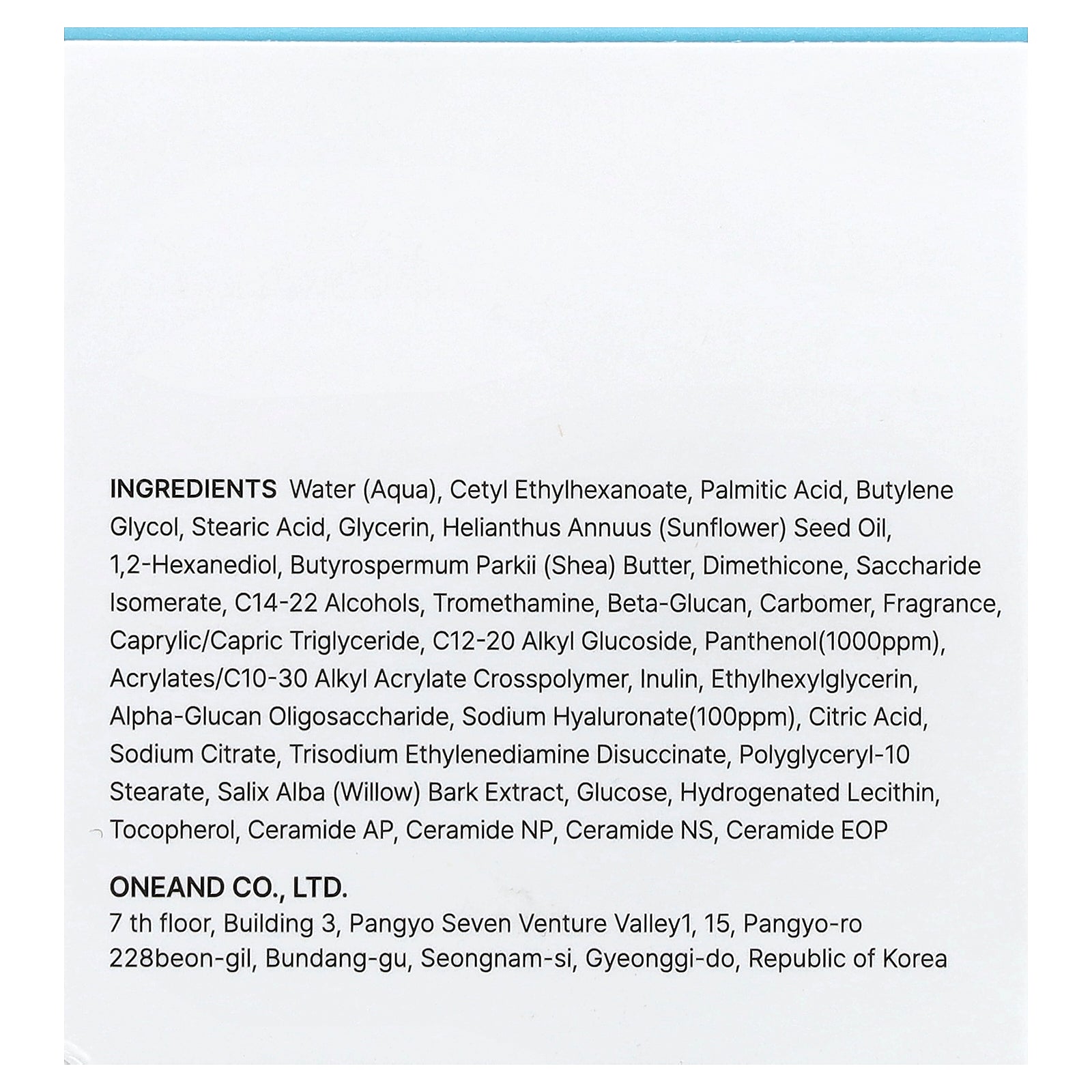Water, cetyl ethylhexanoate, palmitic acid, butylene glycol, stearic acid, glycerin, helianthus annuus (sunflower) seed oil, 1,2-hexanediol, butyrospermum parkii (shea) butter, dimethicone, saccharide isomerate, c14-22 alcohols, tromethamine, beta-glucan, carbomer, fragrance, caprylic/capric triglyceride, c12-20 alkyl glucoside, panthenol (1000 ppm), acrylates/c10-30 alkyl acrylate crosspolymer, inulin, ethylhexylglycerin, alpha-glucan oligosaccharide, sodium hyaluronate (100 ppm), citric acid, sodium citrate, trisodium ethylenediamine disuccinate, polyglyceryl-10 stearate, salix alba (willow) bark extract, glucose, hydrogenated lecithin, tocopherol, ceramide ap, ceramide np, ceramide ns, ceramide eop.