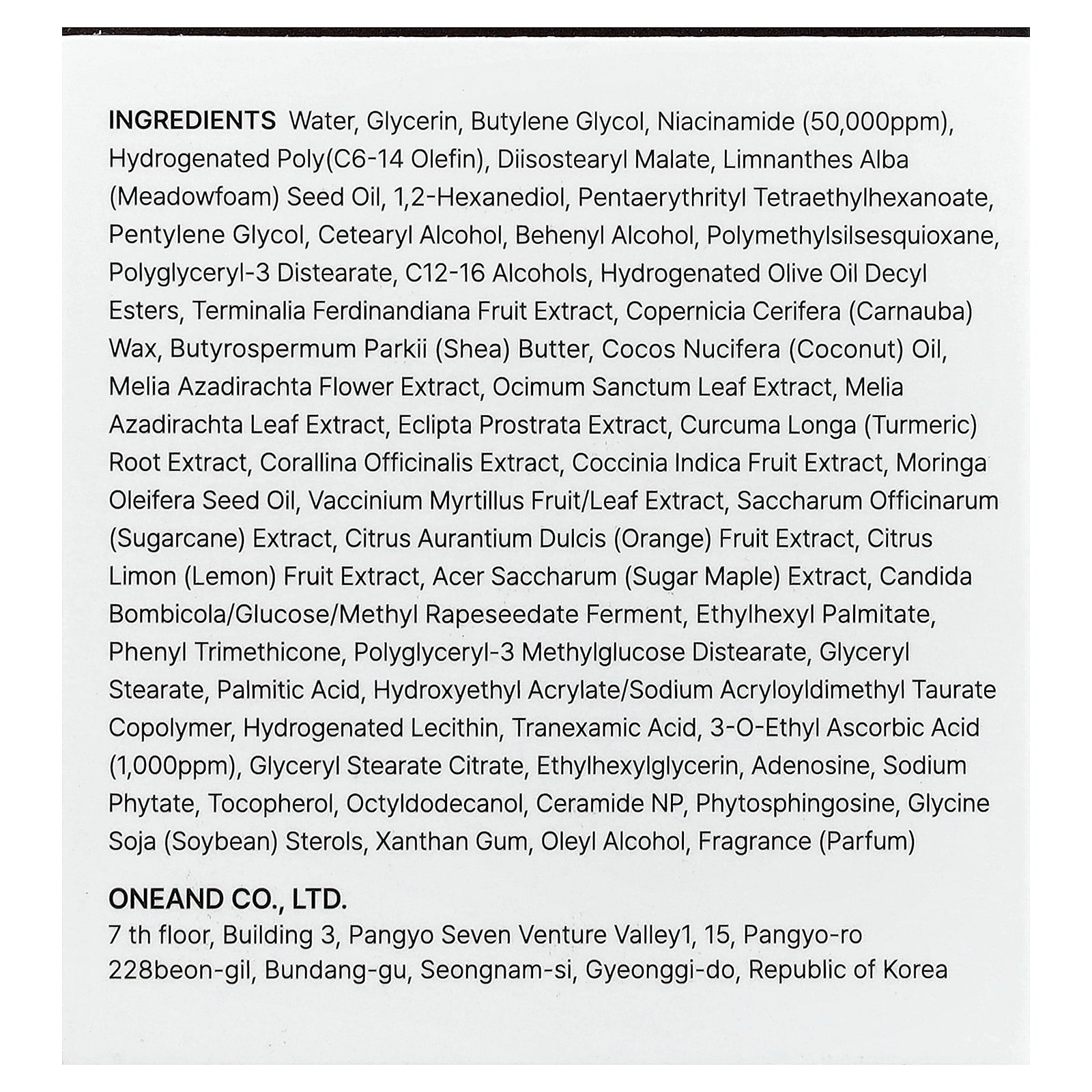Water, glycerin, butylene glycol, niacinamide (50,000 ppm), hydrogenated poly (c6-14 olefin), diisostearyl malate, limnanthes alba (meadowfoam) seed oil, 1,2-hexanediol, pentaerythrityl tetraethylhexanoate, pentylene glycol, cetearyl alcohol, behenyl alcohol, polymethylsilsesquioxane, polyglyceryl-3 distearate, c12-16 alcohols, hydrogenated olive oil decyl esters, terminalia ferdinandiana fruit extract, copernicia cerifera (carnauba) wax, butyrospermum parkii (shea) butter, cocos nucifera (coconut) oil, melia azadirachta flower extract, ocimum sanctum leaf extract, melia azadirachta leaf extract, eclipta prostrata extract, curcuma longa (turmeric) root extract, corallina officinalis extract, coccinia indica fruit extract, moringa oleifera seed oil, vaccinium myrtillus fruit/leaf extract, saccharum officinarum (sugarcane) extract, citrus aurantium dulcis (orange) fruit extract, citrus limon (lemon) fruit extract, acer saccharum (sugar maple) extract, candida bombicola/glucose/methyl rapeseedate ferment, ethylhexyl palmitate, phenyl trimethicone, polyglyceryl-3 methylglucose distearate, glyceryl stearate, palmitic acid, hydroxyethyl acrylate/sodium acryloyldimethyl taurate copolymer, hydrogenated lecithin, tranexamic acid, 3-o-ethyl ascorbic acid (1,000 ppm), glyceryl stearate citrate, ethylhexylglycerin, adenosine, sodium phytate, tocopherol, octyldodecanol, ceramide np, phytosphingosine, glycine soja (soybean) sterols, xanthan gum, oleyl alcohol, fragrance (parfum).