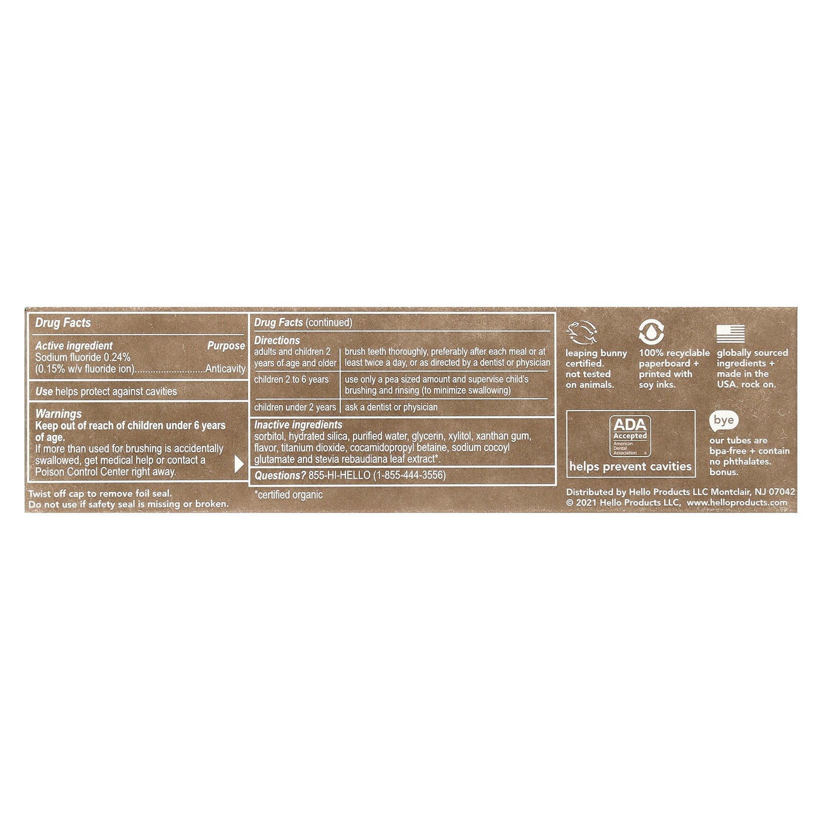 Inactive Ingredients: Sorbitol, hydrated silica, purified water, glycerin, xylitol, xanthan gum, flavor, titanium dioxide, cocamidopropyl betaine, sodium cocoyl glutamate and stevia rebaudiana leaf extract*. *Certified organic |