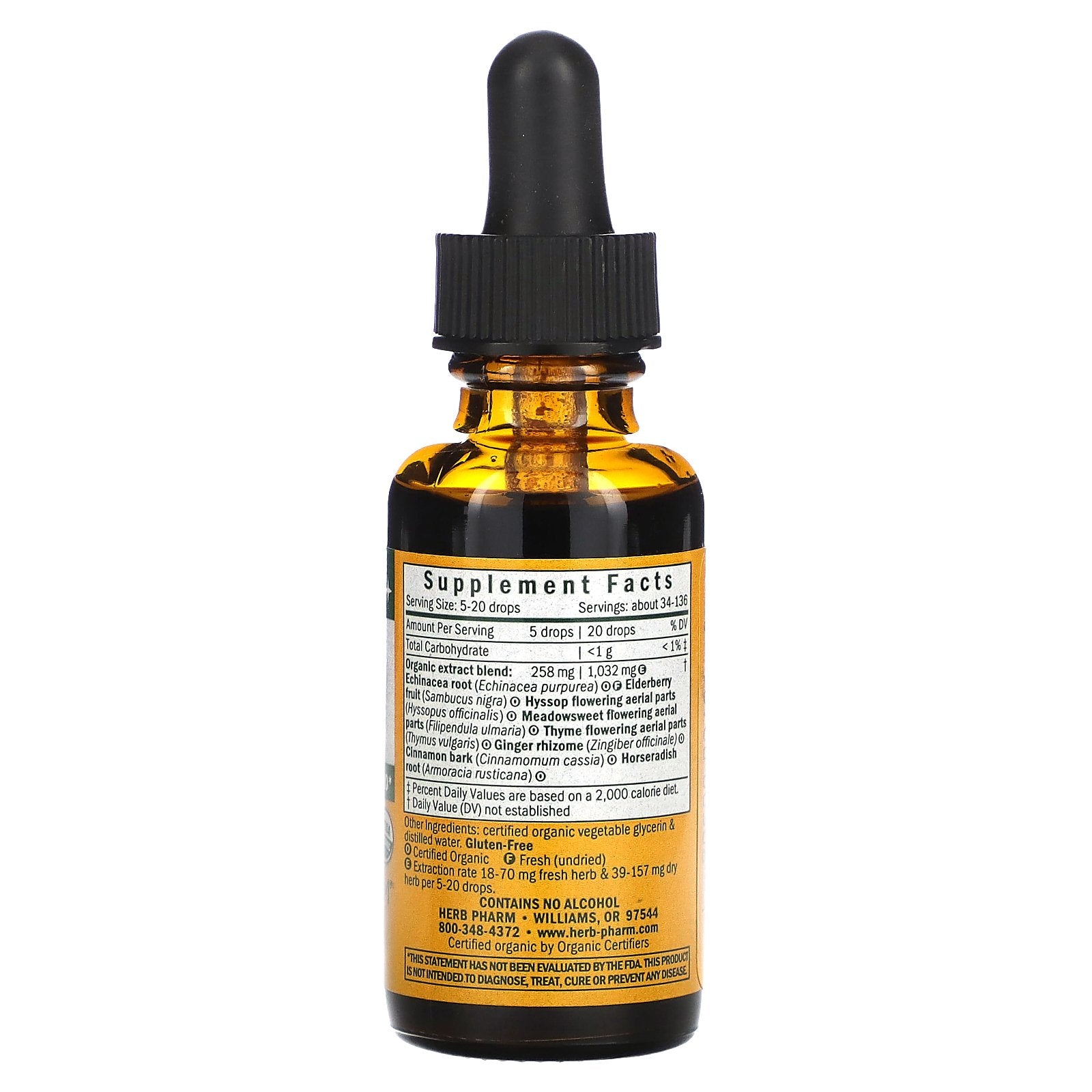 Organic extract blend: Echinacea root (Echinacea purpurea)(O)(F) Elderberry fruit (Sambucus nigra)(O) Hyssop leaf & flower (Hyssopus officinalis)(O) Meadowsweet flowering aerial parts (Filipendula ulmaria)(O) Thyme flowering aerial parts (Thymus vulgaris)(O) Ginger rhizome (Zingiber officinale)(O) Cinnamon bark (Cinnamomum cassia)(O) Horseradish root (Armoracia rusticana) (O) |