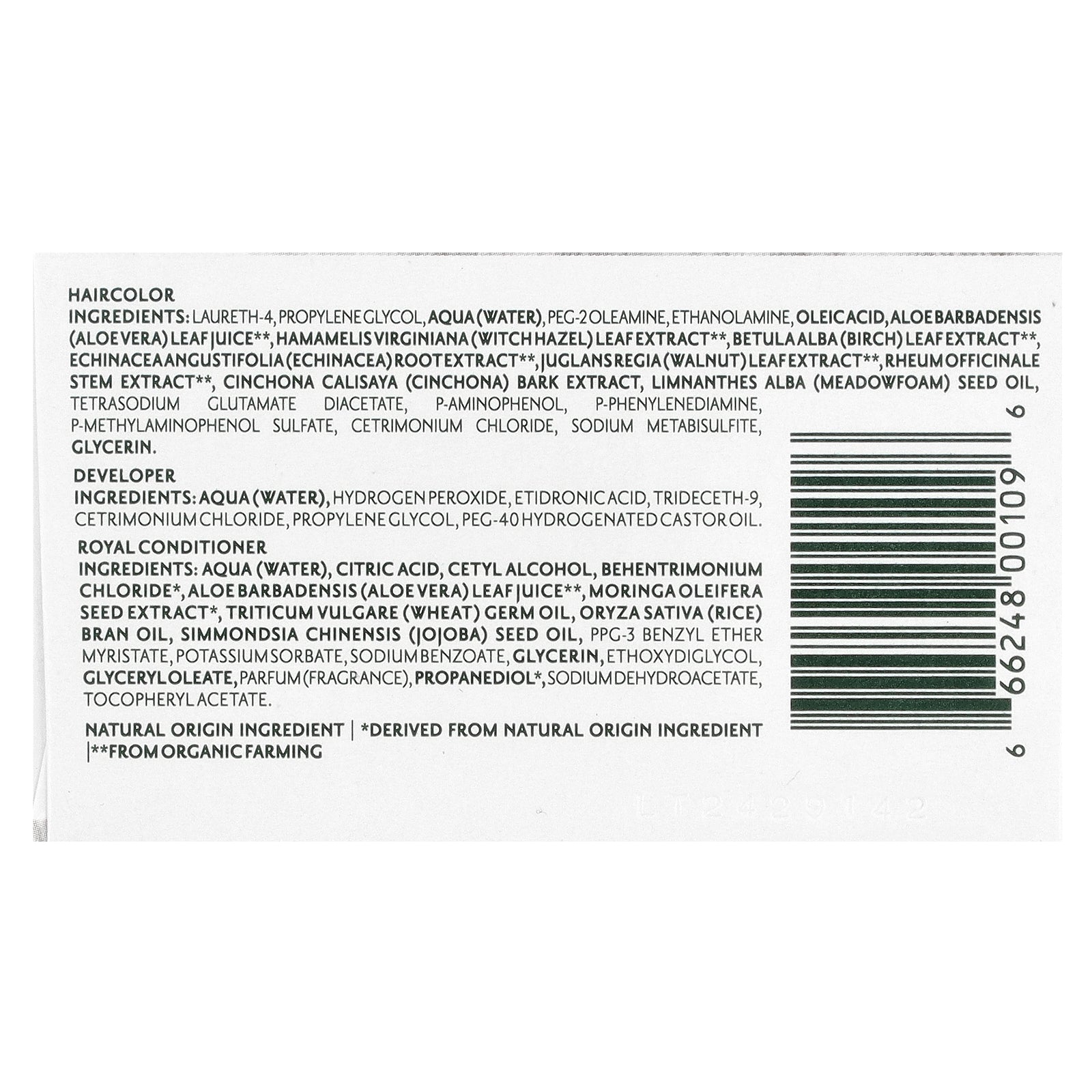 Haircolor ingredients: Laureth-4, propylene glycol, aqua (water), peg-2 oleamine, ethanolamine, oleic acid,aloe barbadensis (aloe vera) leaf juice**, hamamelis virginiana (witchhazel) leaf extract**, betula alba(birch) leaf extract** echinacea angustifolia(echinacea) root extract**, juglans regia(walnut)leaf extract**, rheum officinale stem extract**, cinchona calisaya (cinchona) bark extract, limnanthes alba (meadowfoam) seed oil, tetrasodium glutamate diacetate, p-aminophenol, p-phenylenediamine, p-methylaminophenol sulfate, cetrimonium chloride, sodium metabisulfite, glycerin.