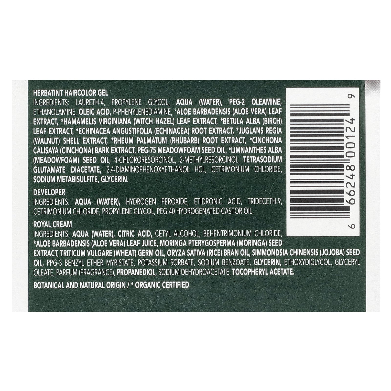 Herbatint haircolor gel ingredients: Laureth-4, propylene glycol, aqua (water), peg-2 oleamine, ethanolamine, oleic acid, p-phenylenediamine, * aloe barbadensis (aloe vera) leaf extract, * hamamelis virginiana (witch hazel) leaf extract, * betula alba (birch) leaf extract, * echinacea angustifolia (echinacea) root extract, * juglans regia (walnut) shell extract, * rheum palmatum (rhubarb) root extract, * cinchona calisaya (cinchona) bark extract, peg-75 meadowfoam seed oil, * limnanthes alba (meadowfoam) seed oil, 4-chlororesorcinol, 2-methylresorcinol, tetrasodium glutamate diacetate, 2,4-diaminophenoxyethanol hcl, cetrimonium chloride, sodium metabisulfite, glycerin.