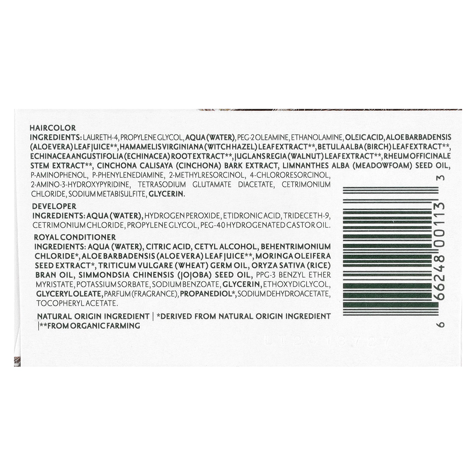 Haircolor ingredients: Laureth-4, propylene glycol, aqua (water), peg-2 oleamine, ethanolamine, oleic acid, aloe barbadensis (aloe vera) leaf juice**, hamamelis virginiana (witchhazel) leaf extract**, betula alba(birch)leaf extract** echinacea angustifolia (echinacea) root extract**, juglans regia (walnut) leaf extract **, rheum officinale stem extract**, cinchona calisaya (cinchona) bark extract, limnanthes alba (meadowfoam) seed oil, p-aminophenol, p-phenylenediamine, 2-methylresorcinol, 4-chlororesorcinol, 2-amino-3-hydroxypyridine, tetrasodium glutamate diacetate, cetrimonium m chloride, sodium metabisulfite, glycerin.