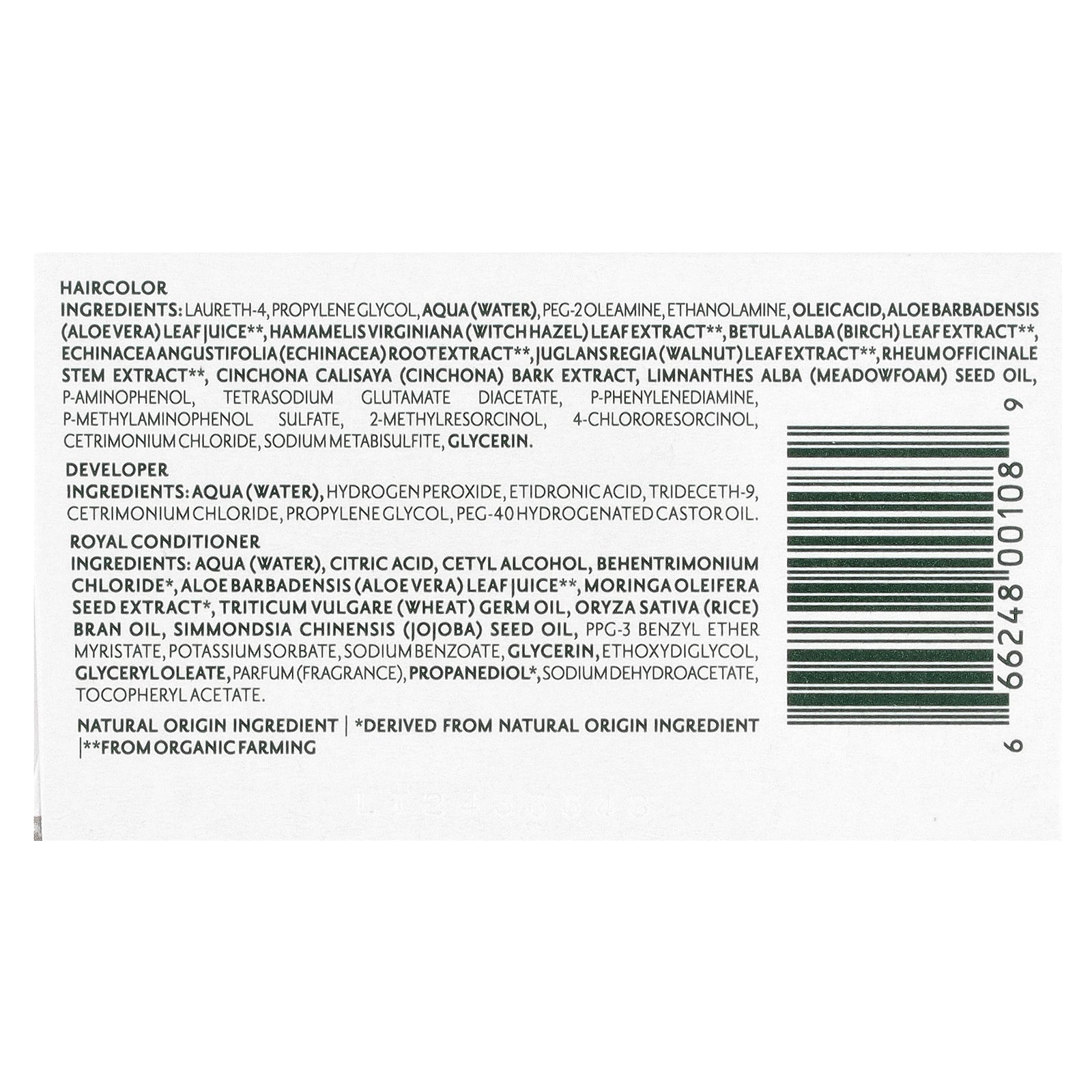 Haircolor ingredients: Laureth-4, propylene glycol, aqua (water), peg-2 oleamine, ethanolamine, oleic acid, aloe barbadensis (aloevera) leaf juice**, hamamelis virginiana (witchhazel) leaf extract**, betula alba (birch) leaf extract** echinacea angustifolia (echinacea) root extract**, juglans regia (walnut) leaf extract**, rheum officinale stem extract**, cinchona calisaya (cinchona) bark extract, limnanthes alba (meadowfoam) seed oil, p-aminophenol, tetrasodium glutamate diacetate, p-phenylenediamine, p-methylaminophenol sulfate, 2-methylresorcinol, 4-chlororesorcinol, cetrimonium chloride, sodium metabisulfite, glycerin.