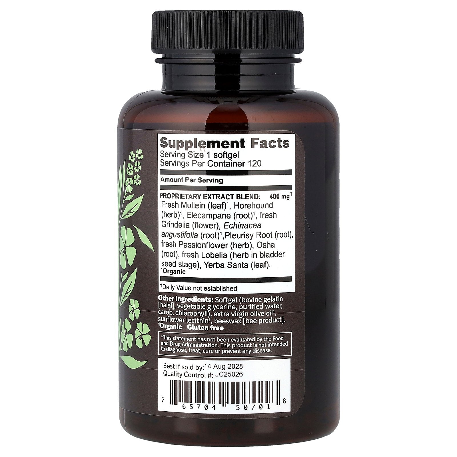 Proprietary Extract Blend: Fresh Mullein (leaf)¹, Horehound (herb)¹, Elecampane (root)¹, fresh Grindelia (flower), Echinacea angustifolia (root)¹, Pleurisy Root (root), fresh Passionflower (herb), Osha (root), fresh Lobelia (herb in bladder seed stage), Yerba Santa (leaf). |