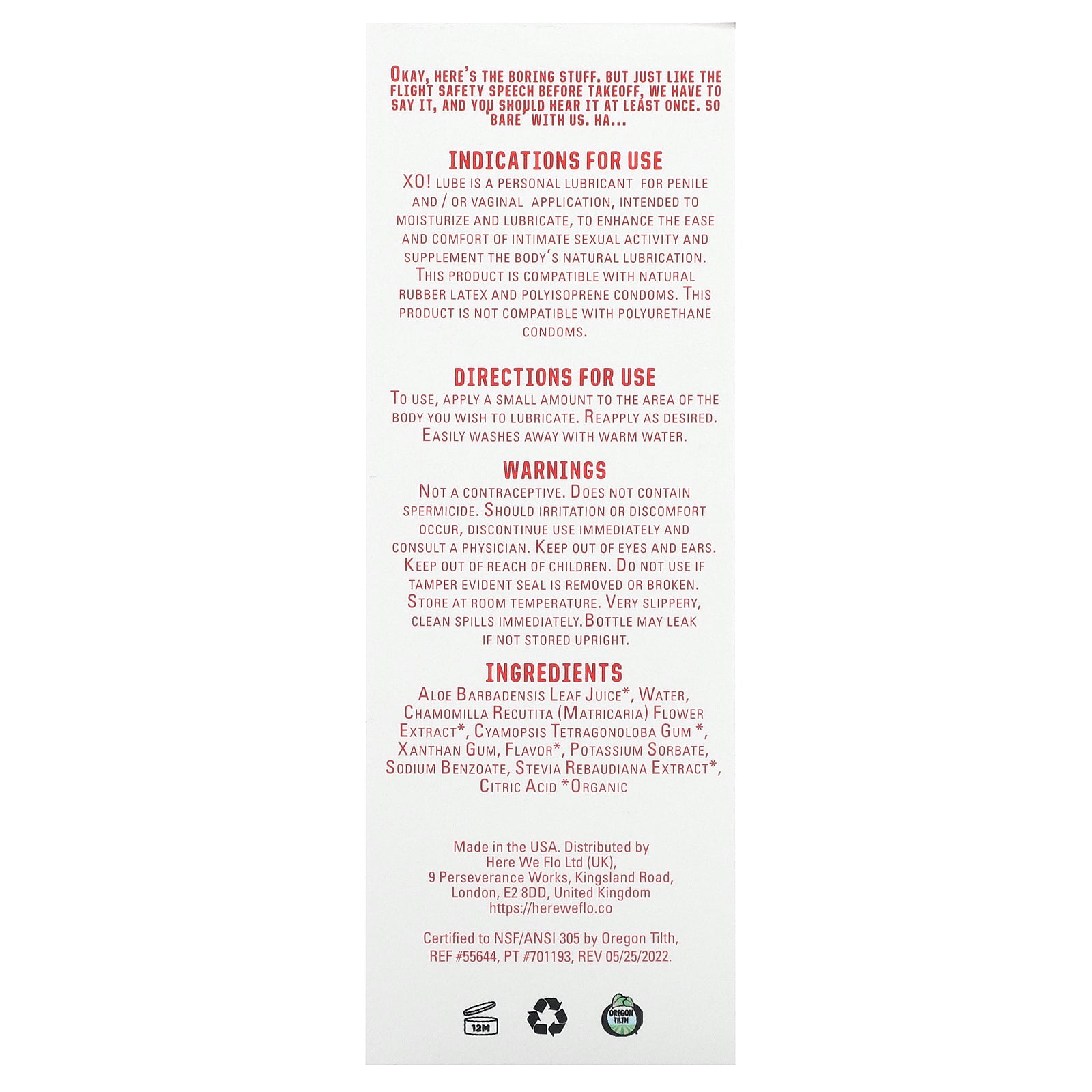 XO! Lube is a personal lubricant for penile and/or vaginal application, intended to moisturize and lubricate, to enhance the ease and comfort of intimate sexual activity and supplement the body's natural lubrication. This product is compatible with natural rubber latex and polyisoprene condoms. this product is not compatible with polyurethane condoms.