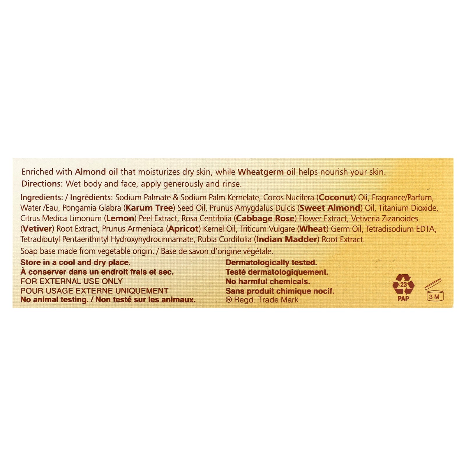 Sodium palmate & sodium palm kernelate, cocos nucifera (coconut) oil, fragrance/parfum, water /eau, pongamia glabra (karum tree) seed oil, prunus amygdalus dulcis (sweet almond) oil, titanium dioxide, citrus medica limonum (lemon) peel extract, rosa centifolia (cabbage rose) flower extract, vetiveria zizanoides (vetiver) root extract, prunus armeniaca (apricot) kernel oil, triticum vulgare (wheat) germ oil, tetradisodium edta, tetradibutyl pentaerithrityl hydroxyhydrocinnamate, rubia cordifolia (indian madder) root extract.