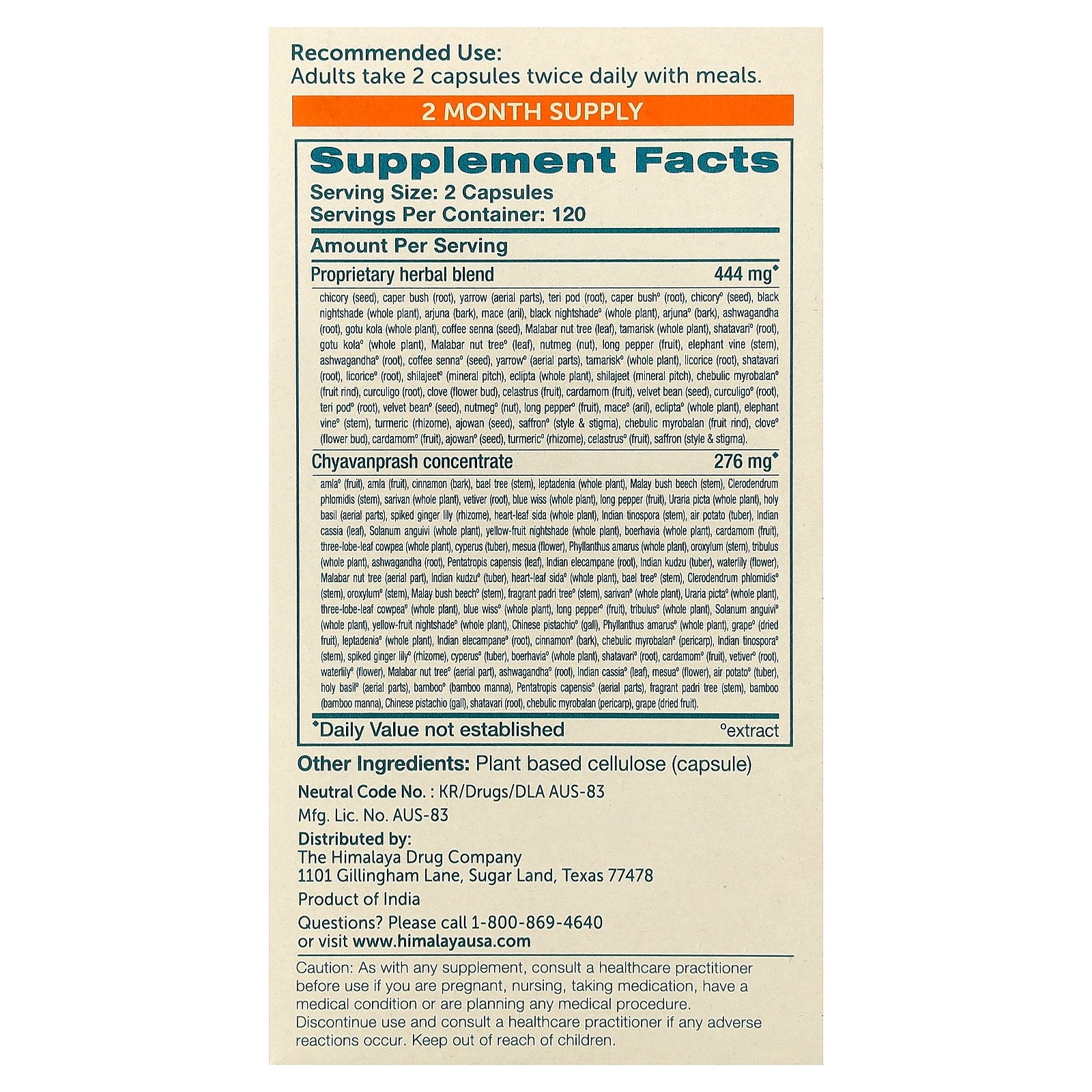 Proprietary herbal blend chicory (seed), caper bush (root), yarrow (aerial parts), teri pod (root), caper bush° (root), chicory° (seed), black nightshade (whole plant), arjuna (bark), mace (aril), black nightshade° (whole plant), arjuna° (bark), ashwagandha (root), gotu kola (whole plant), coffee senna (seed), Malabar nut tree (leaf), tamarisk (whole plant), shatavari° (root), gotu kola° (whole plant), Malabar nut tree° (leaf), nutmeg (nut), long pepper (fruit), elephant vine (stem), ashwagandha° (root), coffee senna° (seed), yarrow° (aerial parts), tamarisk° (whole plant), licorice (root), shatavari (root), licorice° (root), shilajeet° (mineral pitch), eclipta (whole plant), shilajeet (mineral pitch), chebulic myrobalan° (fruit rind), curculigo (root), clove (flower bud), celastrus (fruit), cardamom (fruit), velvet bean (seed), curculigo° (root), teri pod° (root), velvet bean° (seed), nutmeg° (nut), long pepper° (fruit), mace° (aril), eclipta° (whole plant), elephant vine° (stem), turmeric (rhizome), ajowan (seed), saffron° (style & stigma), chebulic myrobalan (fruit rind), clove° (flower bud), cardamom° (fruit), ajowan° (seed), turmeric° (rhizome), celastrus° (fruit), saffron (style & stigma). |