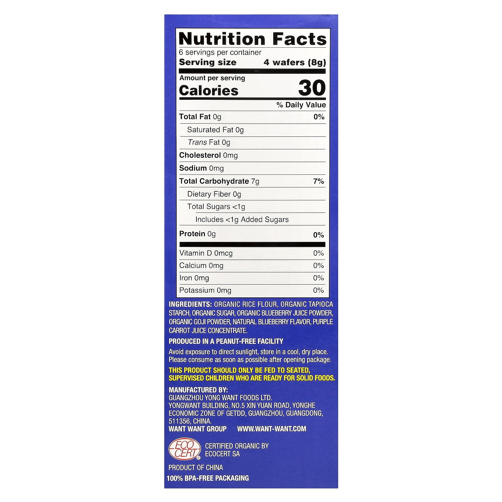 Organic rice flour, organic tapioca starch, organic sugar, organic blueberry juice powder, organic goji powder, natural blueberry flavor, purple carrot juice concentrate.
