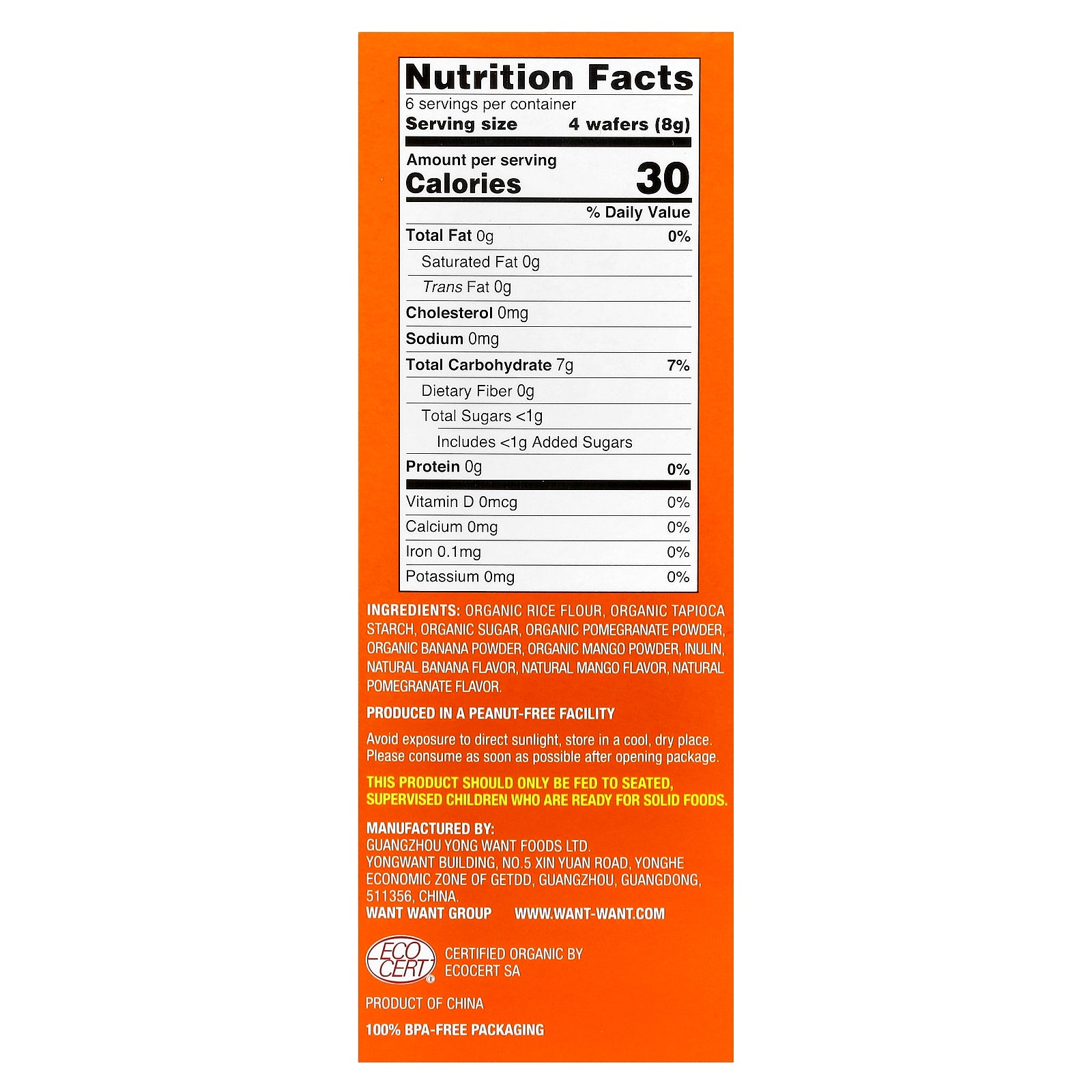 Organic rice flour, organic tapioca starch, organic sugar, organic rice protein, organic pomegranate powder, organic banana powder, organic mango powder, inulin, natural banana flavor, natural mango flavor, natural pomegranate flavor.
