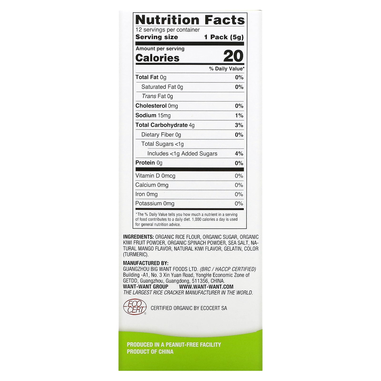 Organic rice flour, organic sugar, organic kiwi powder, organic spinach powder, sea salt, natural mango flavor, natural kiwi flavor, gelatin, color (turmeric).