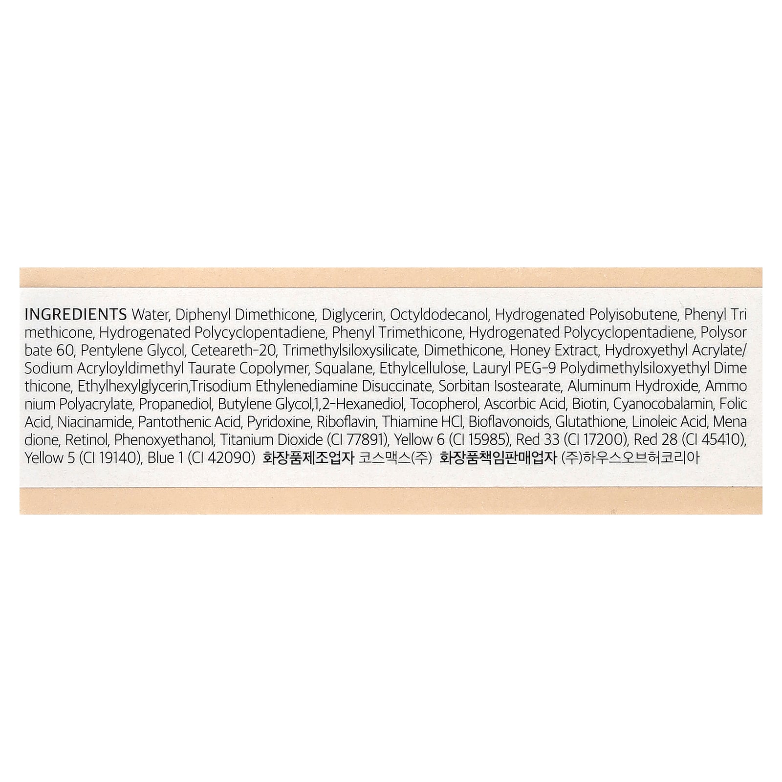 Water, diphenyl dimethicone, diglycerin, octyldodecanol, hydrogenated polyisobutene, phenyl trimethicone, hydrogenated polycyclopentadiene, polysorbate 60, pentylene glycol, ceteareth-20, trimethylsiloxysilicate, dimethicone, honey extract, hydroxyethyl acrylate/ sodium acryloyldimethyl taurate copolymer, squalane, ethylcellulose, lauryl peg-9 polydimethylsiloxyethyl dimethicone, ethylhexylglycerin, trisodium ethylenediamine disuccinate, sorbitan isostearate, aluminum hydroxide, ammonium polyacrylate, propanediol, butylene glycol,1,2-hexanediol, tocopherol, ascorbic acid, biotin, cyanocobalamin, folic acid, niacinamide, pantothenic acid, pyridoxine, riboflavin, thiamine hci, bioflavonoids, glutathione, linoleic acid, menadione, retinol, phenoxyethanol, titanium dioxide (ci 77891), yellow 6 (ci 15985), red 33 (ci 17200), red 28 (ci 45410), yellow 5 (ci 19140), blue 1 (ci 42090).