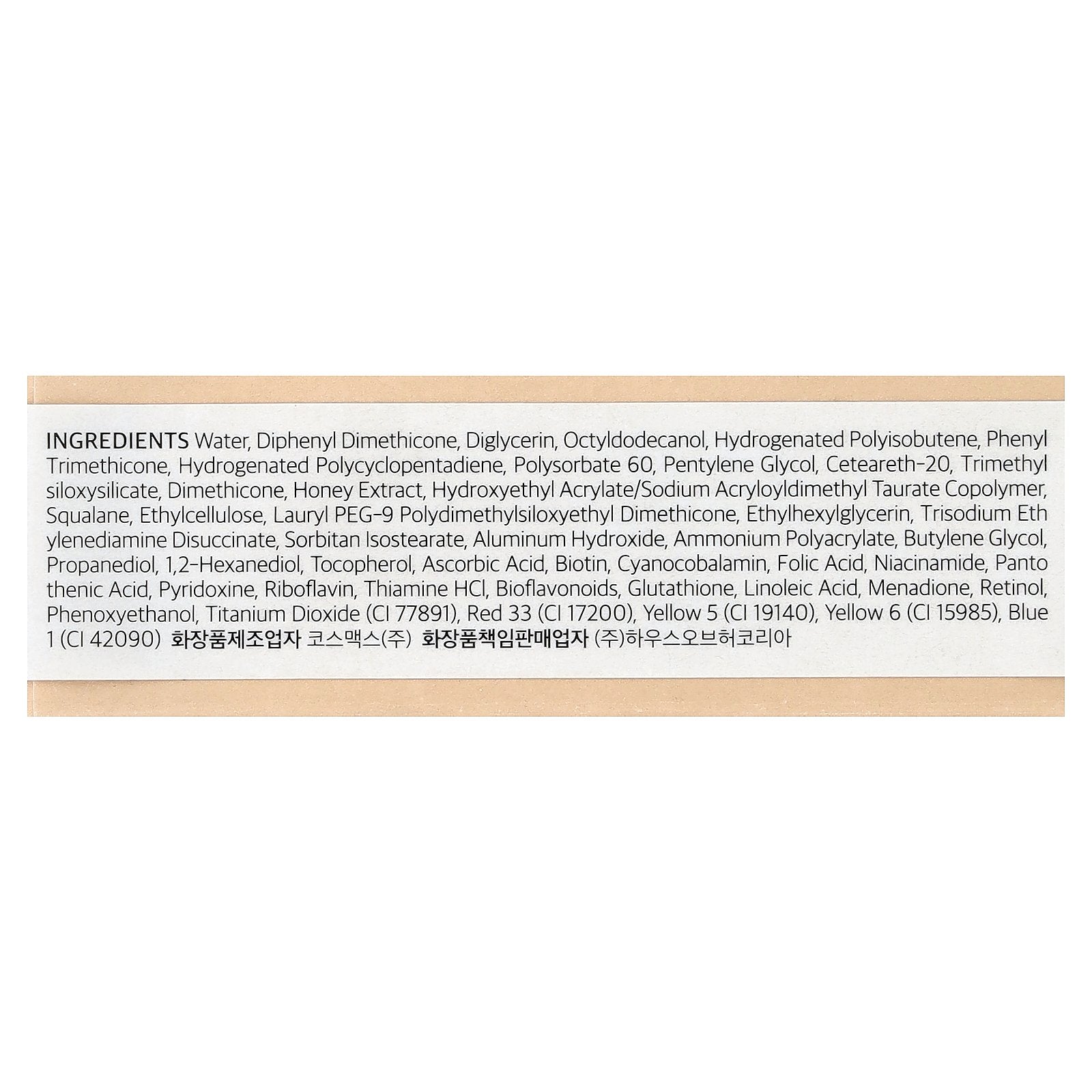 Water, diphenyl dimethicone, diglycerin, octyldodecanol, hydrogenated polyisobutene, phenyl trimethicone, hydrogenated polycyclopentadiene, polysorbate 60, pentylene glycol, ceteareth-20, trimethyl siloxysilicate, dimethicone, honey extract, hydroxyethyl acrylate/sodium acryloyldimethyl taurate copolymer, squalane, ethylcellulose, lauryl peg-9 polydimethylsiloxyethyl dimethicone, ethylhexylglycerin, trisodium ethylenediamine disuccinate, sorbitan isostearate, aluminum hydroxide, ammonium polyacrylate, butylene glycol, propanediol, 1,2-hexanediol, tocopherol, ascorbic acid, biotin, cyanocobalamin, folic acid, niacinamide, pantothenic acid, pyridoxine, riboflavin, thiamine hci, bioflavonoids, glutathione, linoleic acid, menadione, retinol, phenoxyethanol, titanium dioxide (ci 77891), red 33 (ci 17200), yellow 5 (ci 19140), yellow 6 (ci 15985), blue 1 (ci 42090).