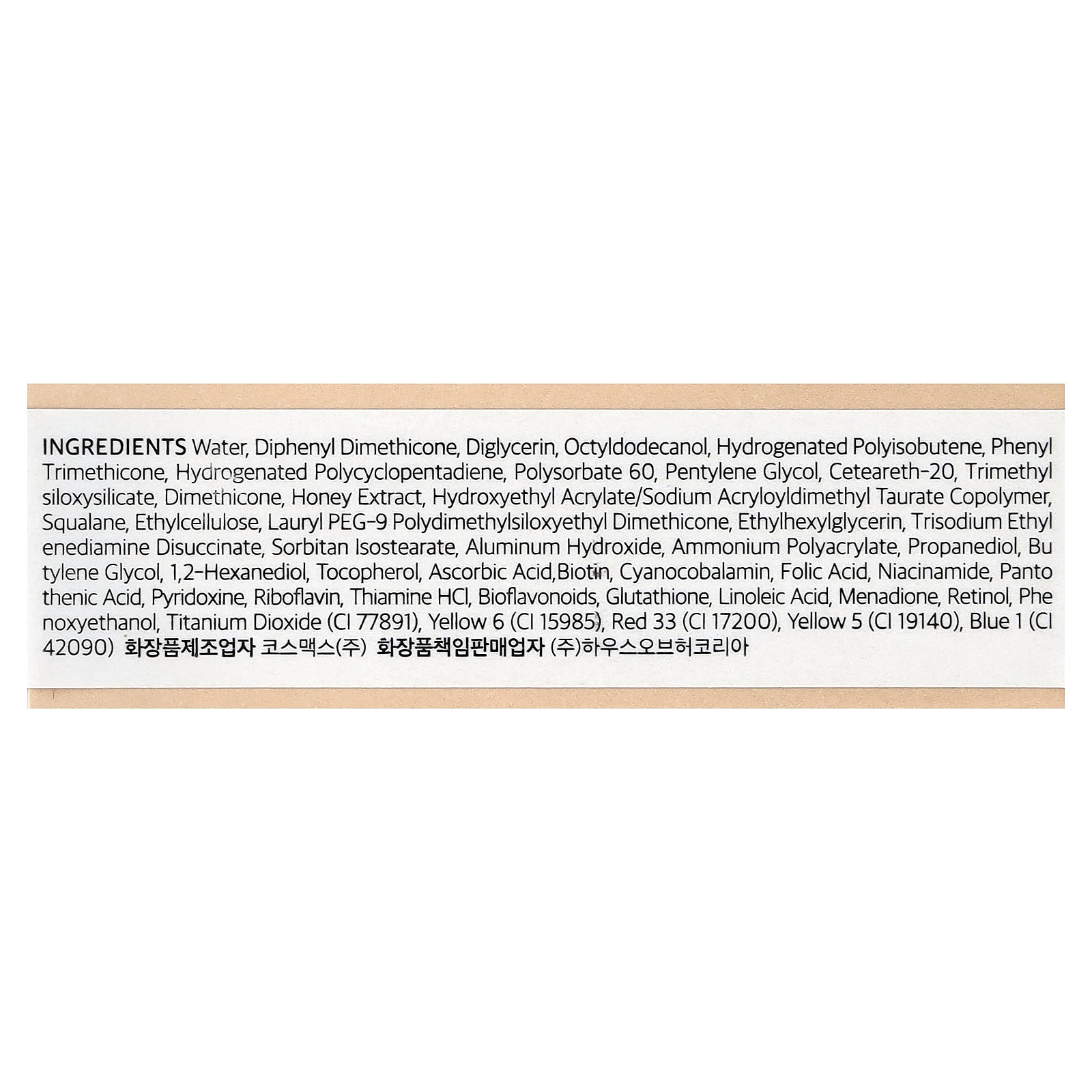 Water, diphenyl dimethicone, diglycerin, octyldodecanol, hydrogenated polyisobutene, phenyl trimethicone, hydrogenated polycyclopentadiene, polysorbate 60, pentylene glycol, ceteareth-20, trimethylsiloxysilicate, dimethicone, honey extract, hydroxyethyl acrylate/sodium acryloyldimethyl taurate copolymer, squalane, ethylcellulose, lauryl peg-9 polydimethylsiloxyethyl dimethicone, ethylhexylglycerin, trisodium ethylenediamine disuccinate, sorbitan isostearate, aluminum hydroxide, ammonium polyacrylate, propanediol, butylene glycol, 1,2-hexanediol, tocopherol, ascorbic acid, biotin, cyanocobalamin, folic acid, niacinamide, pantothenic acid, pyridoxine, riboflavin, thiamine hci, bioflavonoids, glutathione, linoleic acid, menadione, retinol, phenoxyethanol, titanium dioxide (ci 77891), yellow 6 (ci 15985), red 33 (ci 17200), yellow 5 (ci 19140), blue 1 (ci 42090).