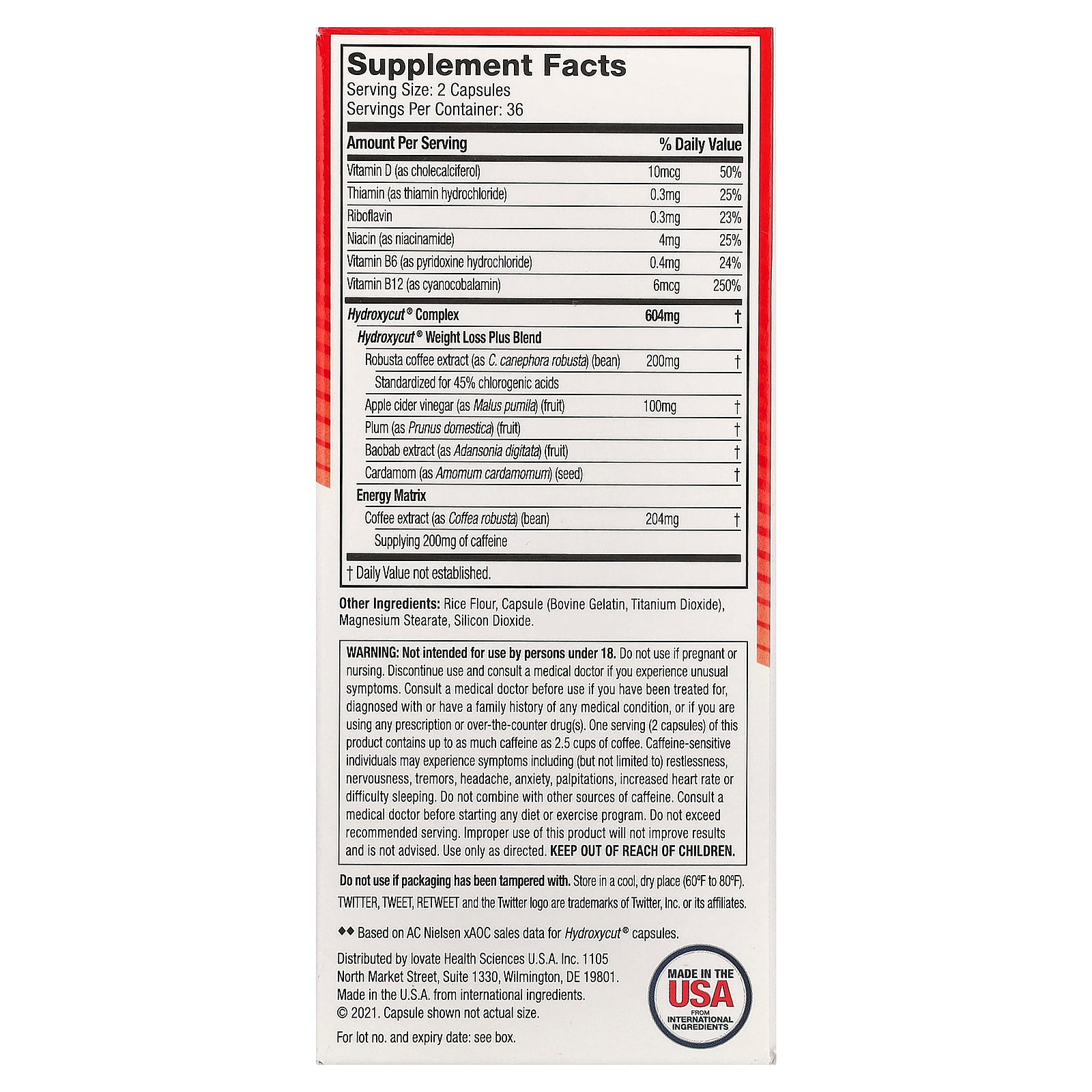 Not intended for use by persons under 18. Do not use if pregnant or nursing. Discontinue use and consult a medical doctor if you experience unusual symptoms. Consult a medical doctor before use if you have been treated for, diagnosed with or have a family history of any medical condition, or if you are using any prescription or over-the-counter drug(s). One serving (2 capsules) of this product contains up to as much caffeine as 2.5 cups of coffee. Caffeine-sensitive individuals may experience symptoms including (but not limited to) restlessness, nervousness, tremors, headache, anxiety, palpitations, increased heart rate or difficulty sleeping. Do not combine with other sources of caffeine. Consult a medical doctor before starting any diet or exercise program. Do not exceed recommended serving. Improper use of this product will not improve results and is not advised. Use only as directed. Keep out of reach of children.