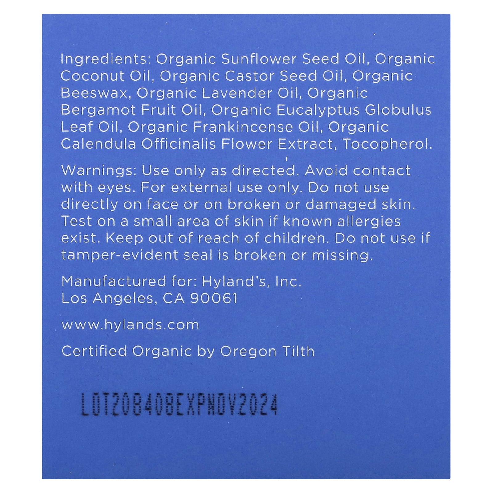 Organic sunflower seed oil, organic coconut oil, organic castor seed oil, organic beeswax, organic lavender oil, organic bergamot fruit oil, organic eucalyptus globulus leaf oil, organic frankincense oil, organic calendula officinalis flower extract, tocopherol.