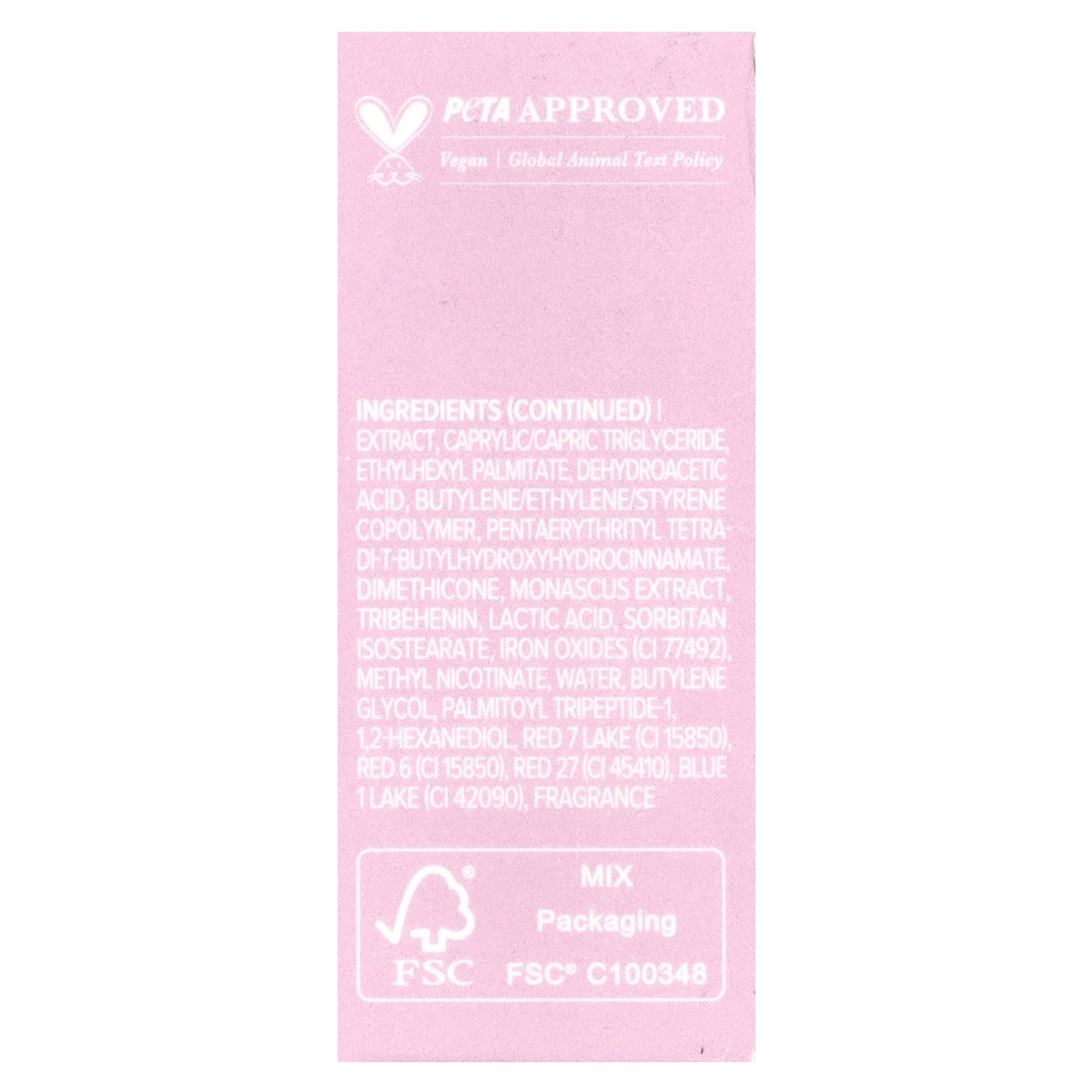 Polyglyceryl-2 triisostearate, hydrogenated polyisobutene, diisostearyl malate, hydrogenated poly(c6-14 olefin) phytosteryl/isostearyl/cetyl/stearyl behenyl dimer dilinoleate, tocopheryl acetate, polyethylene, butyrospermum parkii (shea) butter, silica dimethyl silylate, euphorbia cerifera (candelilla) wax, microcrystalline wax, ozokerite ethylene/propylene/styrene copolymer. copernicia cerifera (carnauba) wax ascorbyl glucoside, hibiscus sabdariffa flower extract, theobroma cacao (cocoa) seed butter, sorbitan sesquioleate, titanium dioxide, prunus amygdalus dulcis (sweet almond) oil, camellia sinensis seed oil, camellia japonica seed oil, argania spinosa kernel oil, olea europaea (olive) fruit oil, macadamia integrifolia (bushnut) seed oil, helianthus annuus (sunflower) seed oil, simmondsia chinensis (jojoba) seed oil, orbignya oleifera seed oil, pyrus malus (apple) seed oil, glycine soja (soybean) oil, pyrus malus (apple) fruit extract, zingiber officinale (ginger) root oil, capsicum frutescens (cayenne) fruit, extract, caprylic/capric triglyceride ethylhexyl palmitate, dehydroacetic acid, butylene/ethylene/styrene copolymer, pentaerythrityl tetra di-t-butylhydroxyhydrocinnamate dimethicone, monascus extract tribehenin, lactic acid, sorbitan sostearate, iron oxides (ci 77492) methyl nicotinate, water, butylene glycol, palmitoyl tripeptide 1. 1.2-hexanediol, red 7 lake (ci 15850) red 6 (ci 15850), red 27 (ci 45410), blue 1 lake (ci 42090), fragrance.