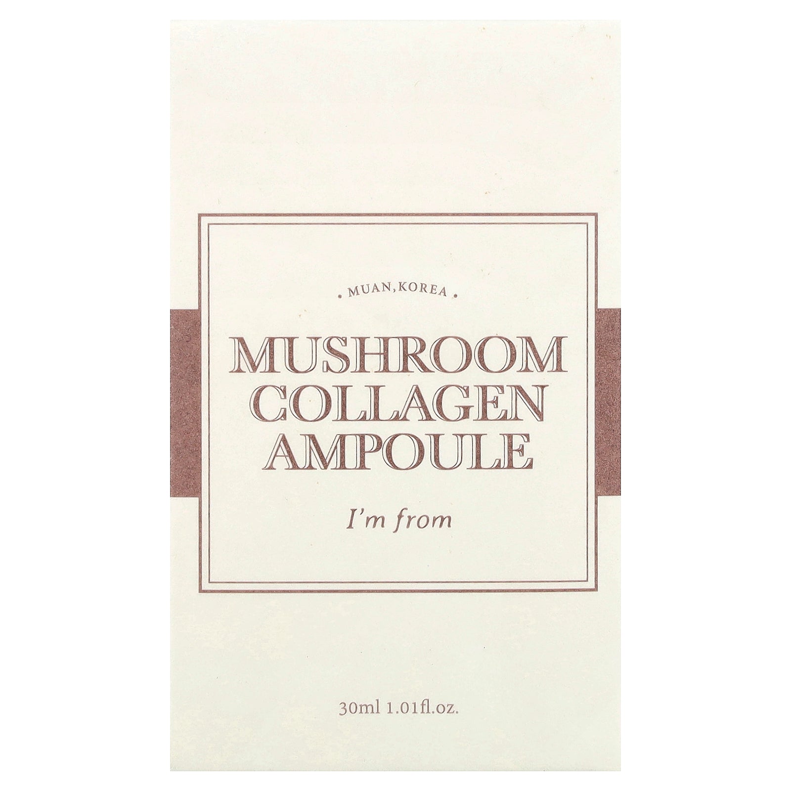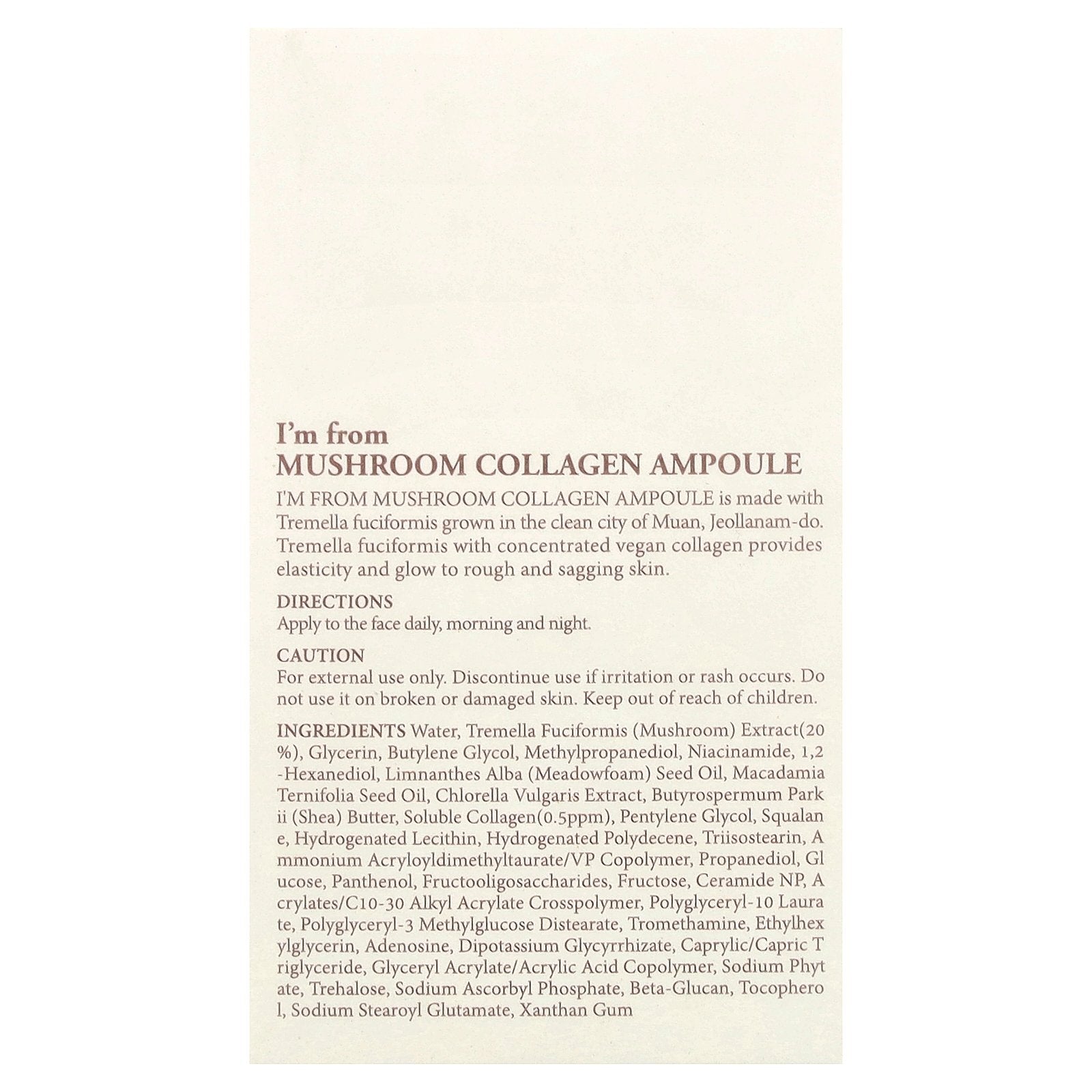 I'm From Mushroom Collagen Ampoule is made with Tremella fuciformis grown in the clean city of Muan, Jeollanam-do. Tremella fuciformis with concentrated vegan collagen provides elasticity and glow to rough and sagging skin.