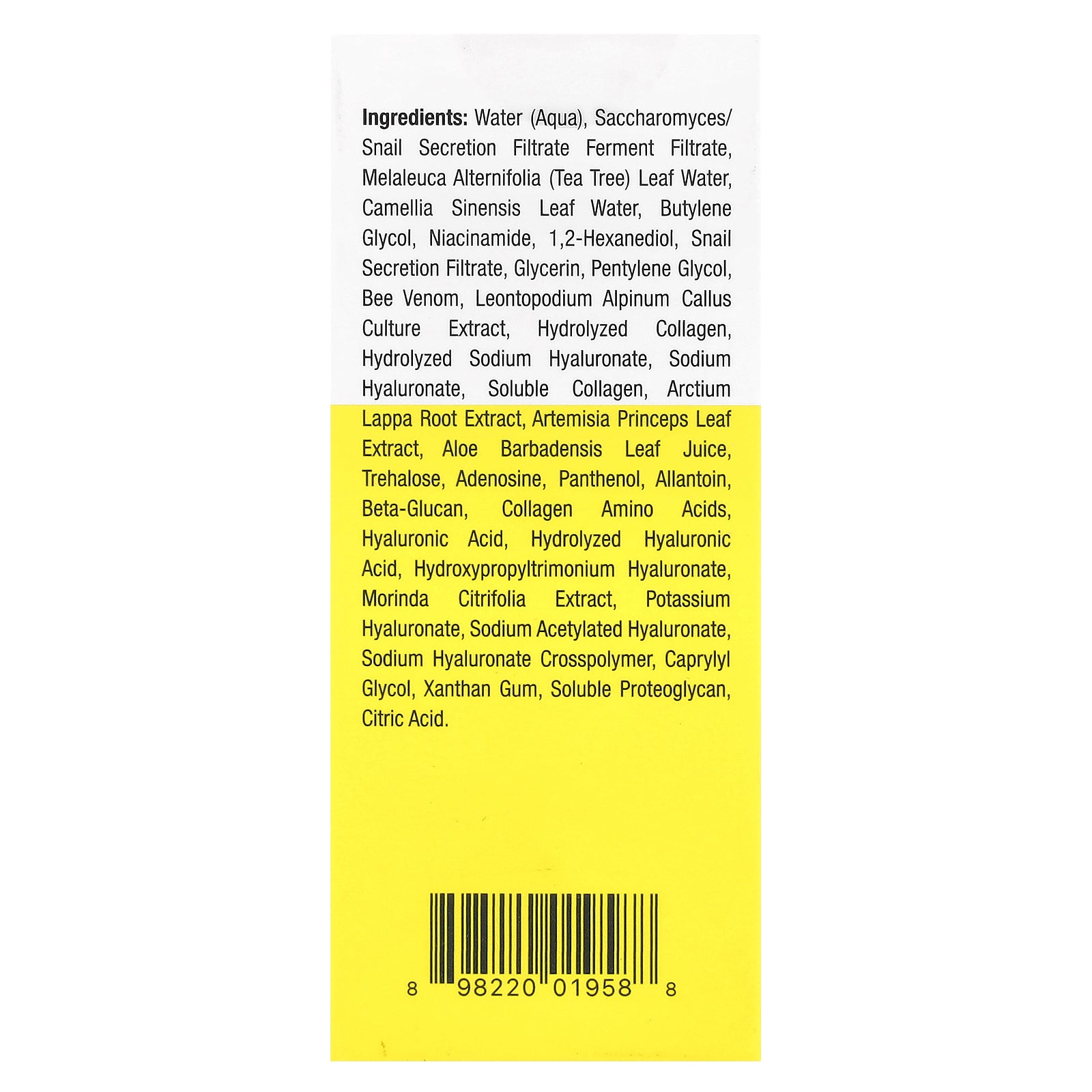Water (Aqua), Saccharomyces/ Snail Secretion Filtrate Ferment Filtrate, Melaleuca Alternifolia (Tea Tree) Leaf Water, Camellia Sinensis Leaf Water, Butylene Glycol, Niacinamide, 1,2-Hexanediol, Snail Secretion Filtrate, Glycerin, Pentylene Glycol, Bee Venom, Leontopodium Alpinum Callus Culture Extract, Hydrolyzed Collagen, Hydrolyzed Sodium Hyaluronate, Sodium Hyaluronate, Soluble Collagen, Arctium Lappa Root Extract, Artemisia Princeps Leaf Extract, Aloe Barbadensis Leaf Juice, Trehalose, Adenosine, Panthenol, Allantoin, Beta-Glucan, Collagen Amino Acids, Hyaluronic Acid, Hydrolyzed Hyaluronic Acid, Hydroxypropyltrimonium Hyaluronate, Morinda Citrifolia Extract, Potassium Hyaluronate, Sodium Acetylated Hyaluronate, Sodium Hyaluronate Crosspolymer, Caprylyl Glycol, Xanthan Gum, Soluble Proteoglycan, Citric Acid.