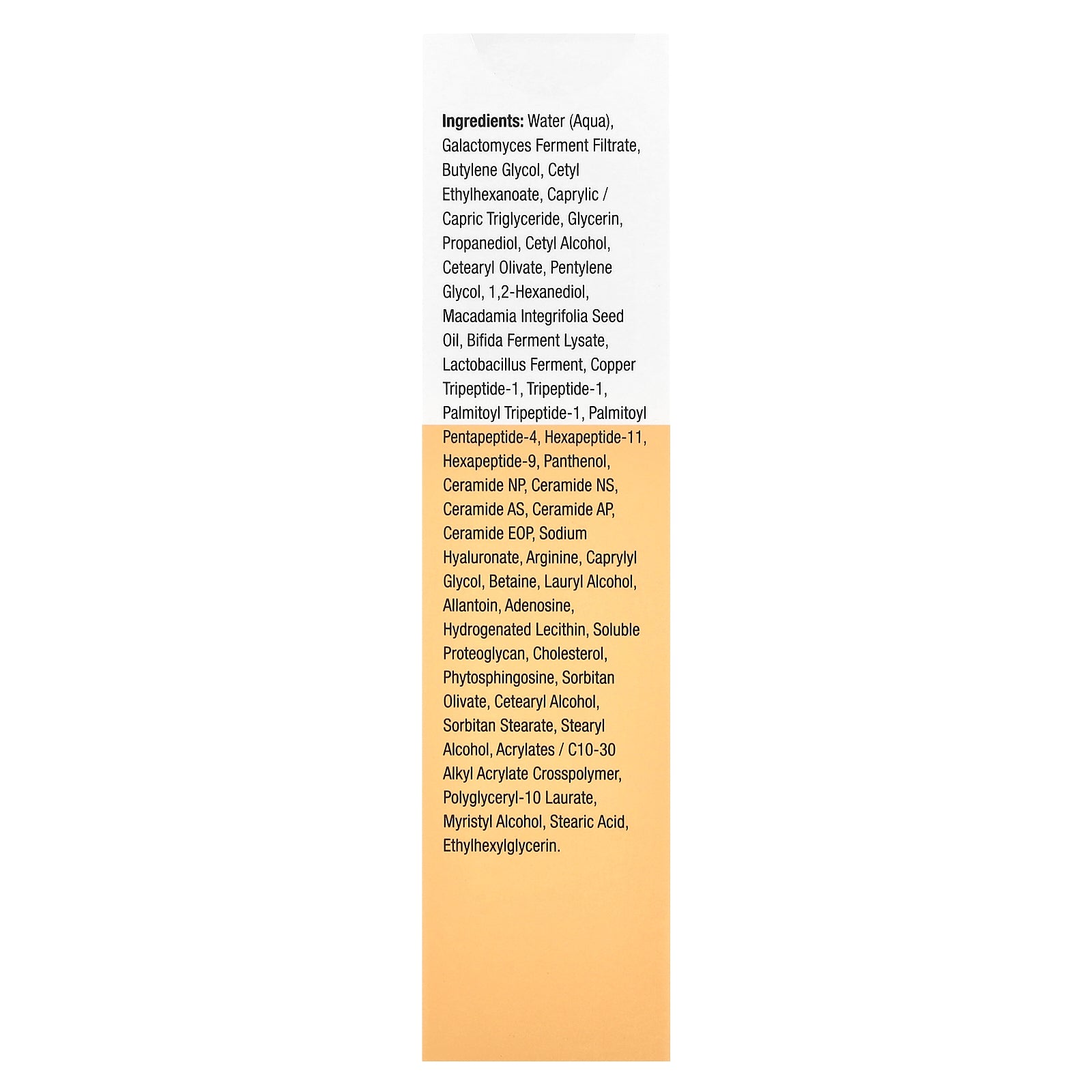 Water (Aqua), Galactomyces Ferment Filtrate, Butylene Glycol, Cetyl Ethylhexanoate, Caprylic / Capric Triglyceride, Glycerin, Propanediol, Cetyl Alcohol, Cetearyl Olivate, Pentylene Glycol, 1,2-Hexanediol, Macadamia Integrifolia Seed Oil, Bifida Ferment Lysate, Lactobacillus Ferment, Copper Tripeptide-1, Tripeptide-1, Palmitoyl Tripeptide-1, Palmitoyl Pentapeptide-4, Hexapeptide-11, Hexapeptide-9, Panthenol, Ceramide NP, Ceramide NS, Ceramide AS, Ceramide AP, Ceramide EOP, Sodium Hyaluronate, Arginine, Caprylyl Glycol, Betaine, Lauryl Alcohol, Allantoin, Adenosine, Hydrogenated Lecithin, Soluble Proteoglycan, Cholesterol, Phytosphingosine, Sorbitan Olivate, Cetearyl Alcohol, Sorbitan Stearate, Stearyl Alcohol, Acrylates / C10-30 Alkyl Acrylate Crosspolymer, Polyglyceryl-10 Laurate, Myristyl Alcohol, Stearic Acid, Ethylhexylglycerin.