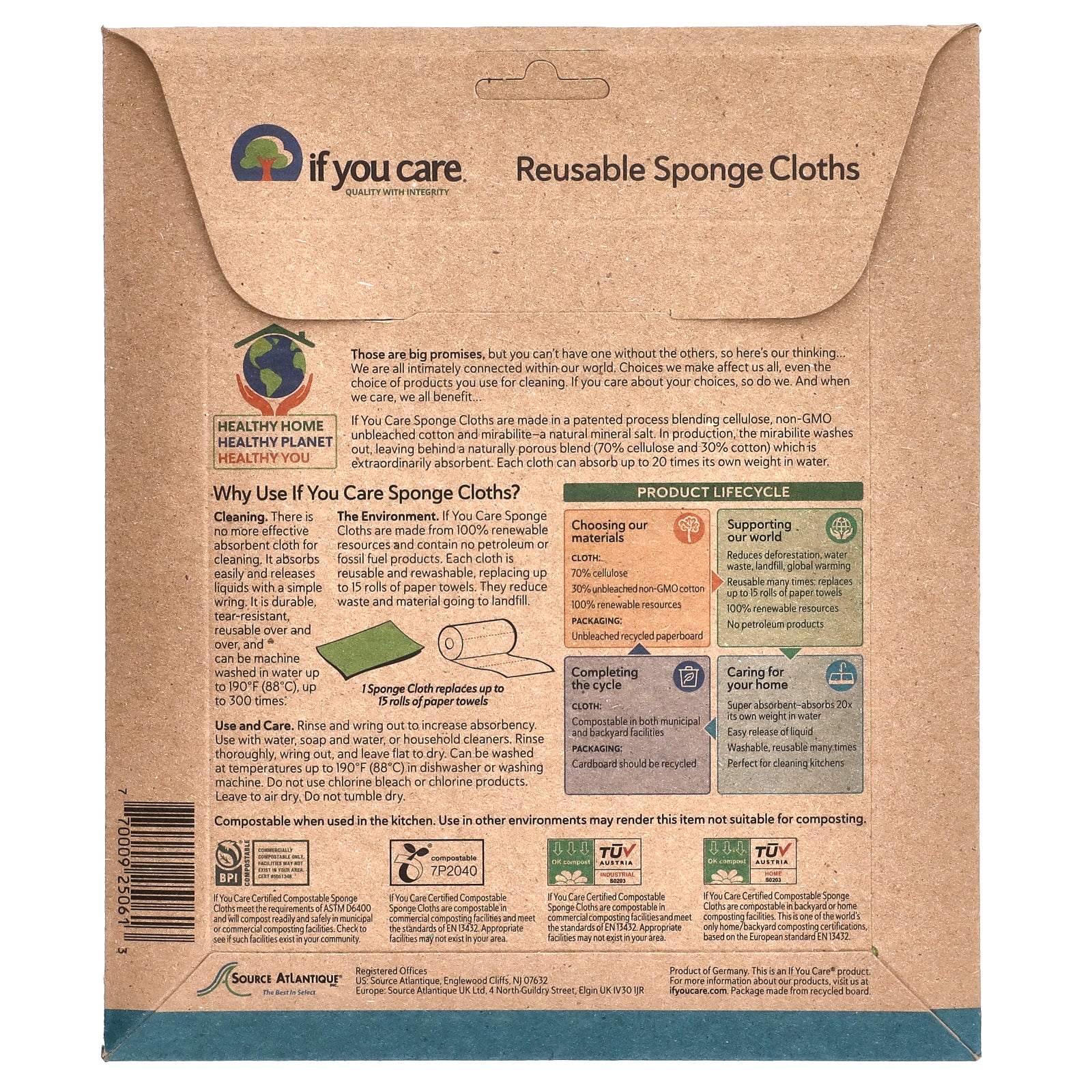 The Environment. If You Care Sponge Cloths are made from 100% renewable resources and contain no petroleum or fossil fuel products. Each cloth is reusable and rewashable, replacing up to 15 rolls of paper towels. They reduce waste and material going to landfill.