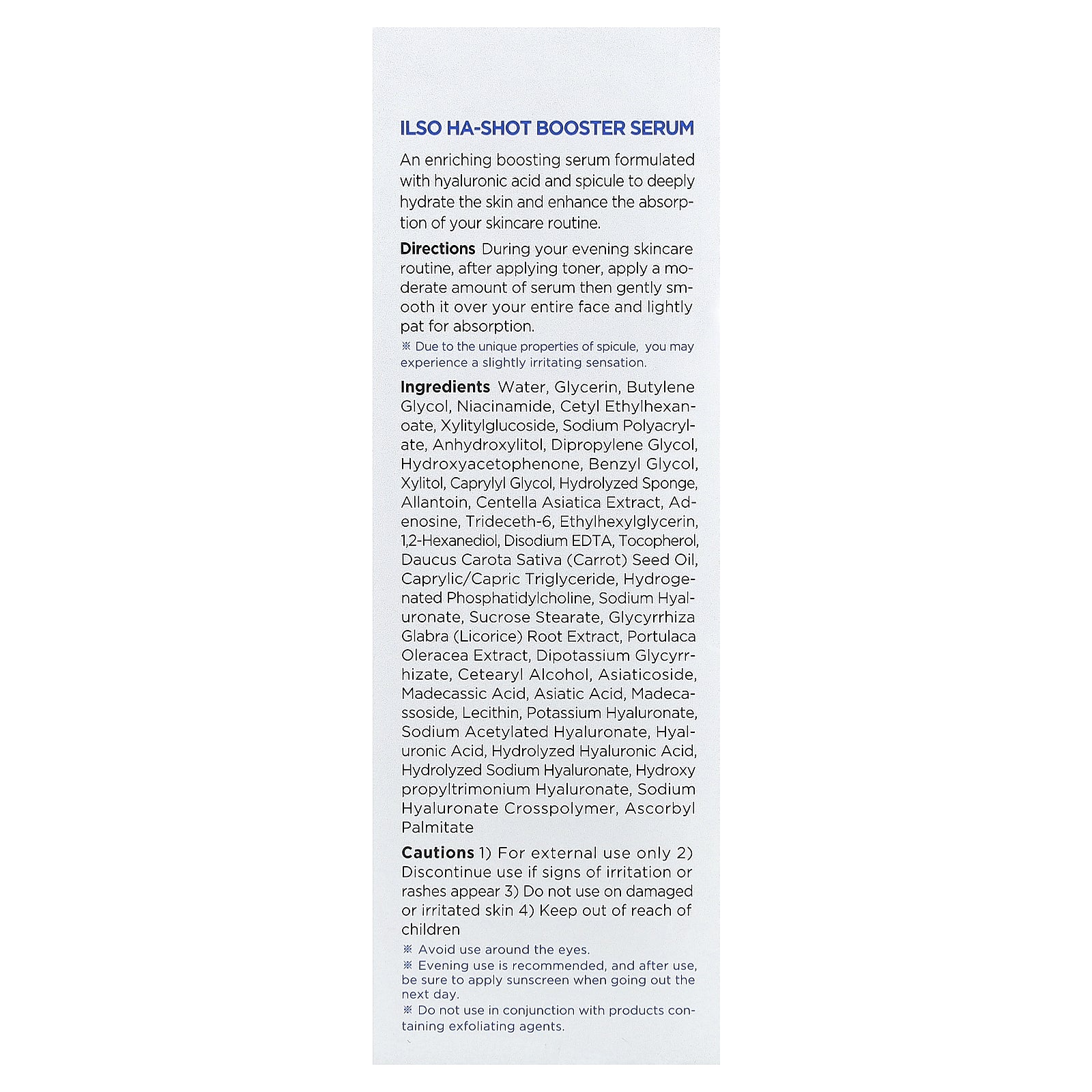 Water, glycerin, butylene glycol, niacinamide, cetyl ethylhexanoate, xylitylglucoside, sodium polyacrylate, anhydroxylitol, dipropylene glycol, hydroxyacetophenone, benzyl glycol, xylitol, caprylyl glycol, hydrolyzed sponge, allantoin, centella asiatica extract, adenosine, trideceth-6, ethylhexylglycerin, 1,2-hexanediol, disodium edta, tocopherol, daucus carota sativa (carrot) seed oil, caprylic/capric triglyceride, hydrogenated phosphatidylcholine, sodium hyal- uronate, sucrose stearate, glycyrrhiza glabra (licorice) root extract, portulaca oleracea extract, dipotassium glycyrrhizate, cetearyl alcohol, asiaticoside, madecassic acid, asiatic acid, madecassoside, lecithin, potassium hyaluronate, sodium acetylated hyaluronate, hyaluronic acid, hydrolyzed hyaluronic acid, hydrolyzed sodium hyaluronate, hydroxypropyltrimonium hyaluronate, sodium hyaluronate crosspolymer, ascorbyl palmitate.