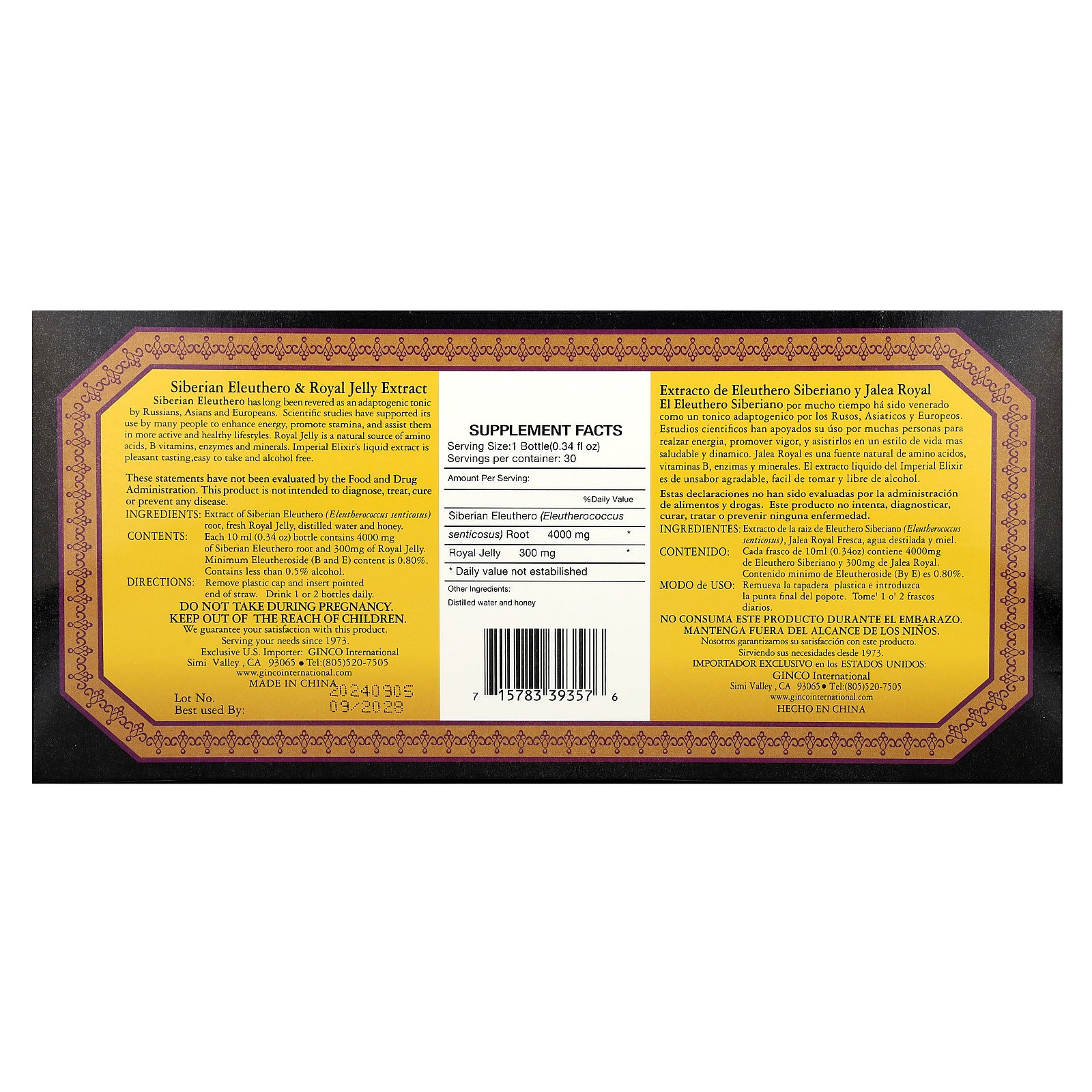 Each 10 ml (0.34 oz) bottler contains 4000 mg of Siberian Eleuthero root and 300 mg of Royal Jelly. Minimum Eleutheroside (B and E) content is 0.80%. Contains less than 0.5% alcohol.