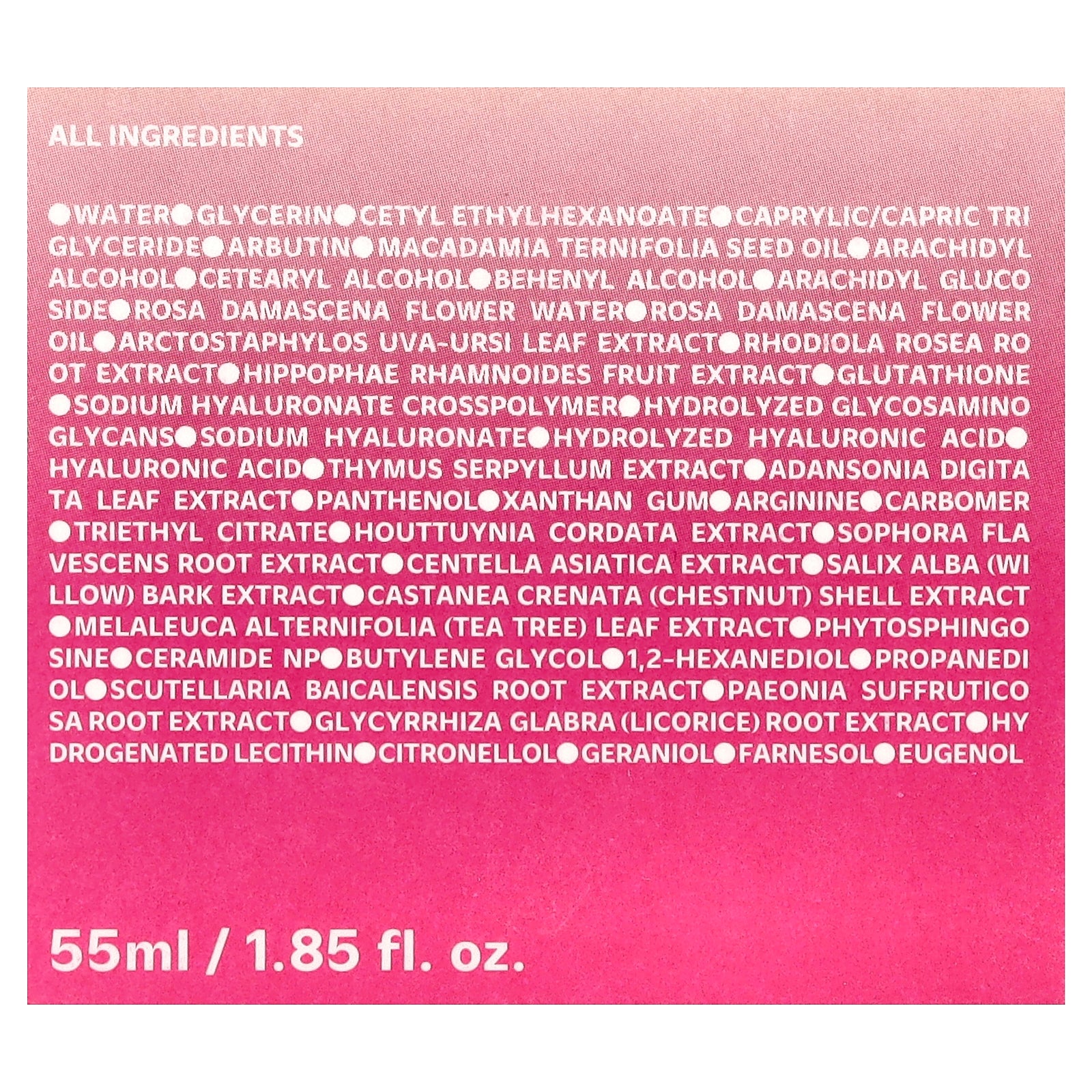 Water, glycerin, cetyl ethylhexanoate, caprylic/capric triglyceride, arbutin, macadamia ternifolia seed oil, arachidyl alcohol, cetearyl alcohol, behenyl alcohol, arachidyl glucoside, rosa damascena flower water, rosa damascena flower oil, arctostaphylos uva-ursi leaf extract, rhodiola rosea root extract, hippophae rhamnoides fruit extract, glutathione, sodium hyaluronate crosspolymer, hydrolyzed glycosamino glycanso sodium hyaluronateohydrolyzed hyaluronic acid, hyaluronic acid, thymus serpyllum extract, adansonia digitata leaf extract, panthenol, xanthan gum, arginine, carbomer, triethyl citrate, houttuynia cordata extract, sophora flavescens root extract, centella asiatica extract, salix alba (willow) bark extract, castanea crenata (chestnut) shell extract, melaleuca alternifolia (tea tree) leaf extract, phytosphingosine, ceramide np, butylene glycol, 1,2-hexanediol, propanediol, scutellaria baicalensis root extract, paeonia suffruticosa root extract, glycyrrhiza glabra (licorice) root extract, hydrogenated lecithin, citronellol, geraniol, farnesol, eugenol.