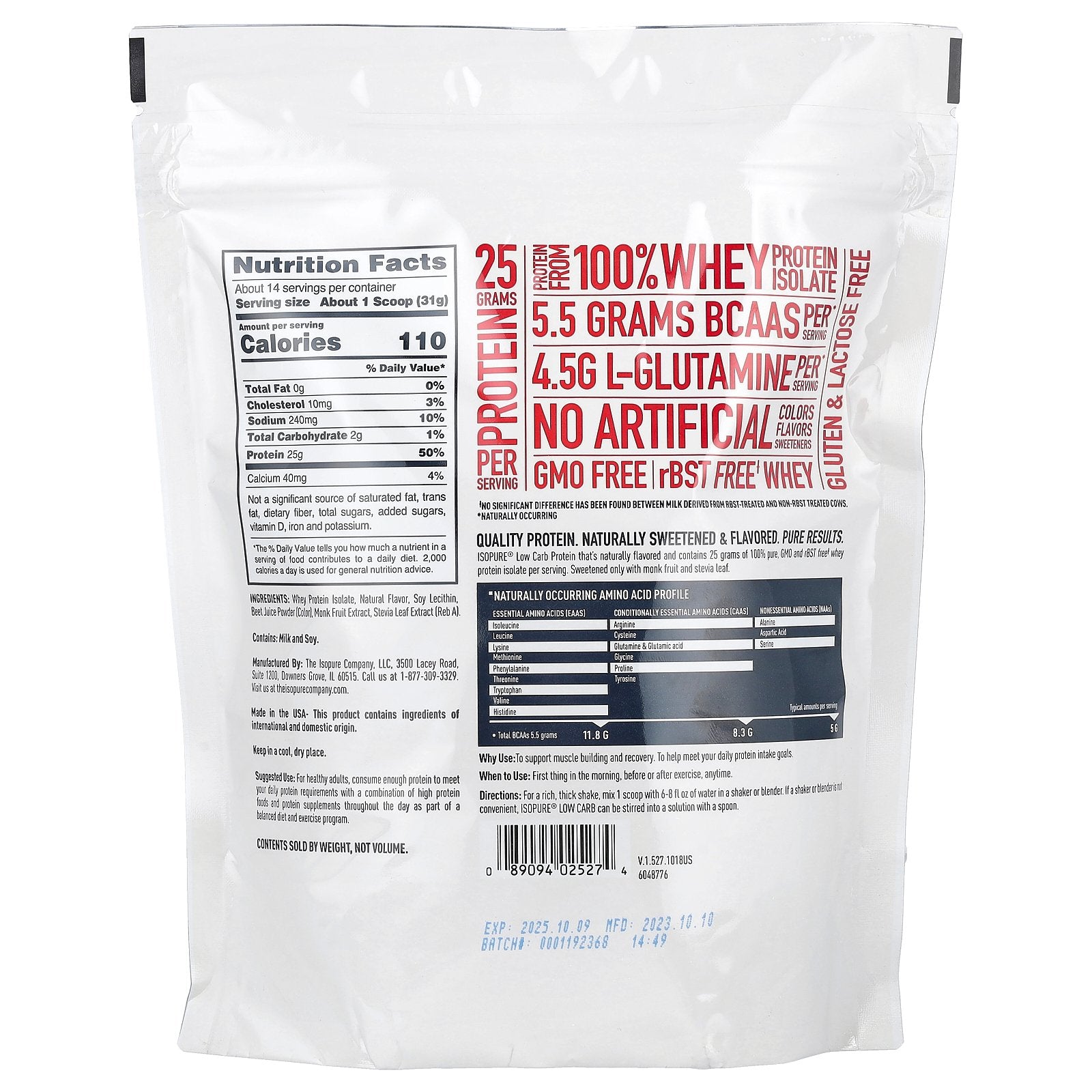 Isopure® Low Carb Protein that's naturally flavored and contains 25 grams of 100% pure, GMO and rBST free† whey protein isolate per serving. Sweetened only with monk fruit and stevia leaf.