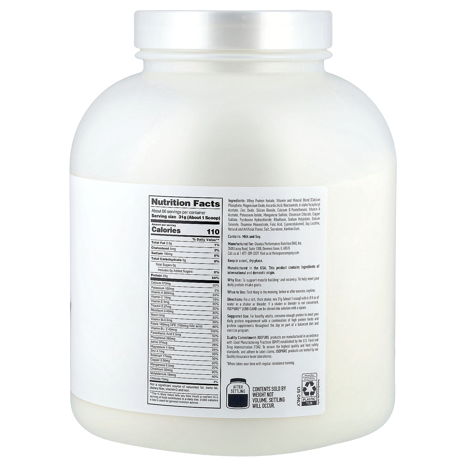 25 grams of delicious 100% pure, rBST free†, whey protein isolate with zero grams of carbs. 100% whey protein isolate means exceptional purity and quality: excess fat, cholesterol, sugars, carbs are filtered out. And each serving delivers 5.5 grams of naturally occurring BCAAS, 4 grams of naturally occurring glutamine/glutamic acid, and provides immune support from vitamin A, C, E and zinc to support your micronutrient needs