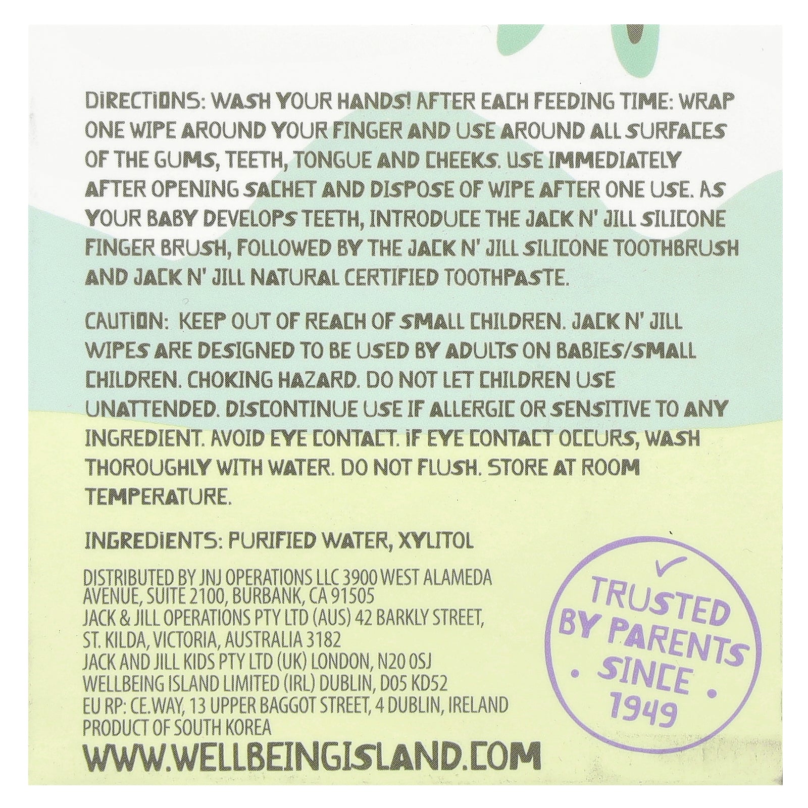 Wash your hands! After each feeding time: wrap one wipe around your finger and use around all surfaces of the gums, teeth, tongue and cheeks. Use immediately after opening sachet and dispose of wipe after one use. As your baby develops teeth, introduce the Jack n' Jill Silicone Finger Brush, followed by the Jack n' Jill Silicone Toothbrush and Jack n' Jill Natural Certified Toothpaste.