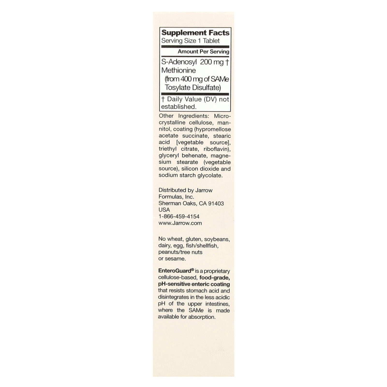 Jarrow Formulas® SAMe 200 provides a full 200 mg SAMe (net yield) from 400 mg of SAMe tosylate disulfate. SAMe 200 is manufactured under low temperature and low humidity and is enteric-coated to ensure a biologically active product.