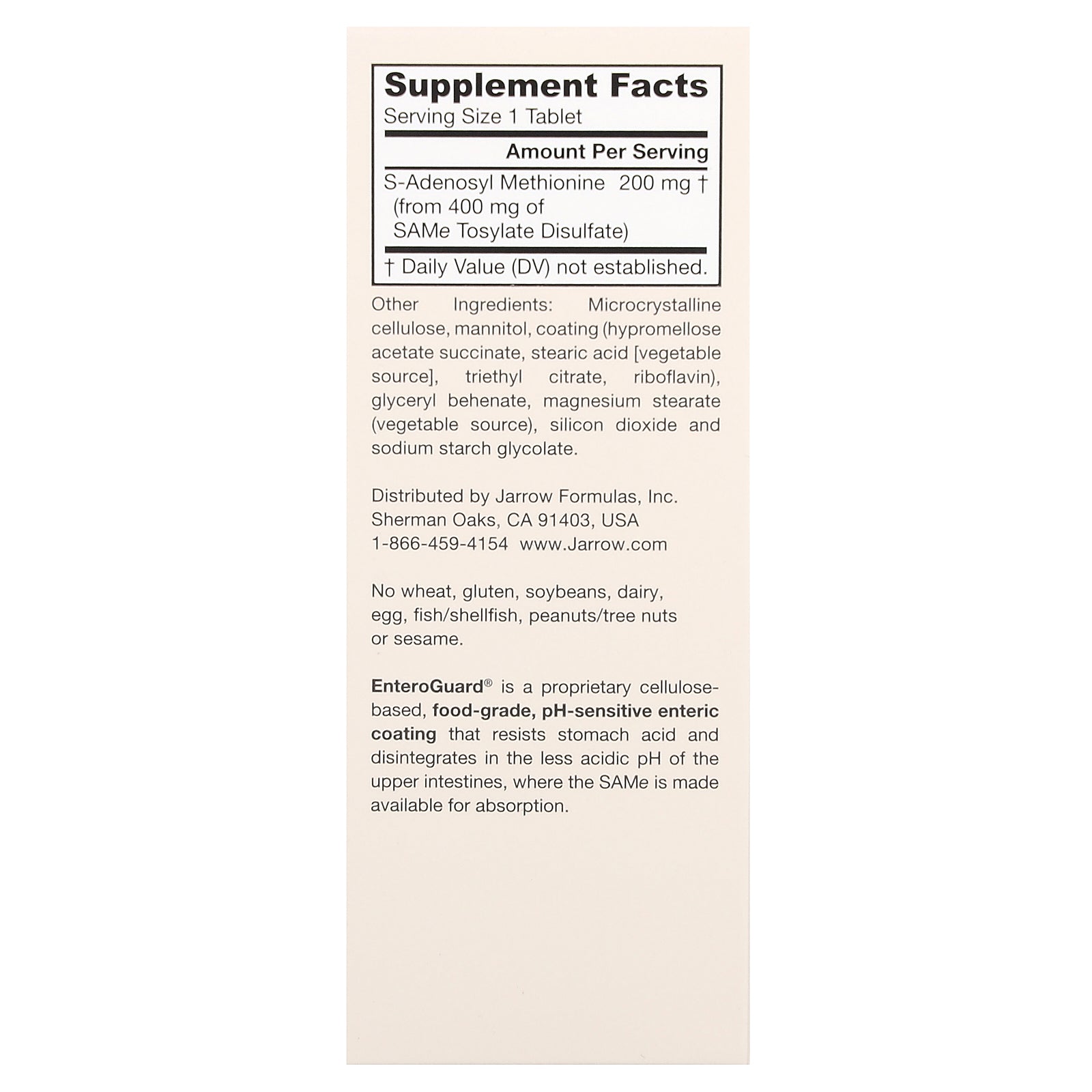 Jarrow Formulas® SAMe 200 provides a full 200 mg SAMe (net yield) from 400 mg of SAMe tosylate disulfate. SAMe 200 is manufactured under low temperature and low humidity and is enteric-coated to ensure a biologically active product.