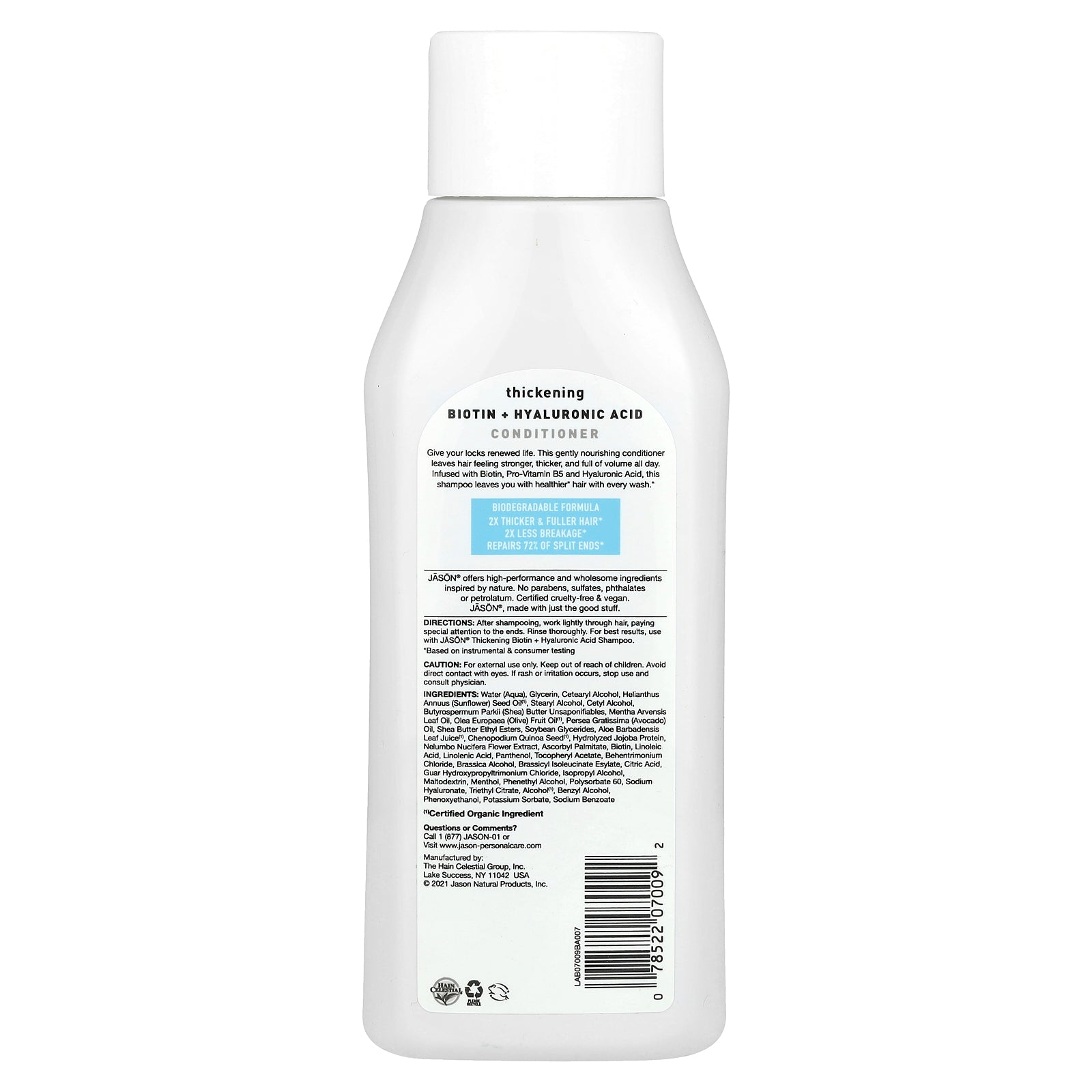 After shampooing, work lightly through hair, paying special attention to the ends. Rinse thoroughly. For best results, use with Jason® Thickening Biotin + Hyaluronic Acid Shampoo.